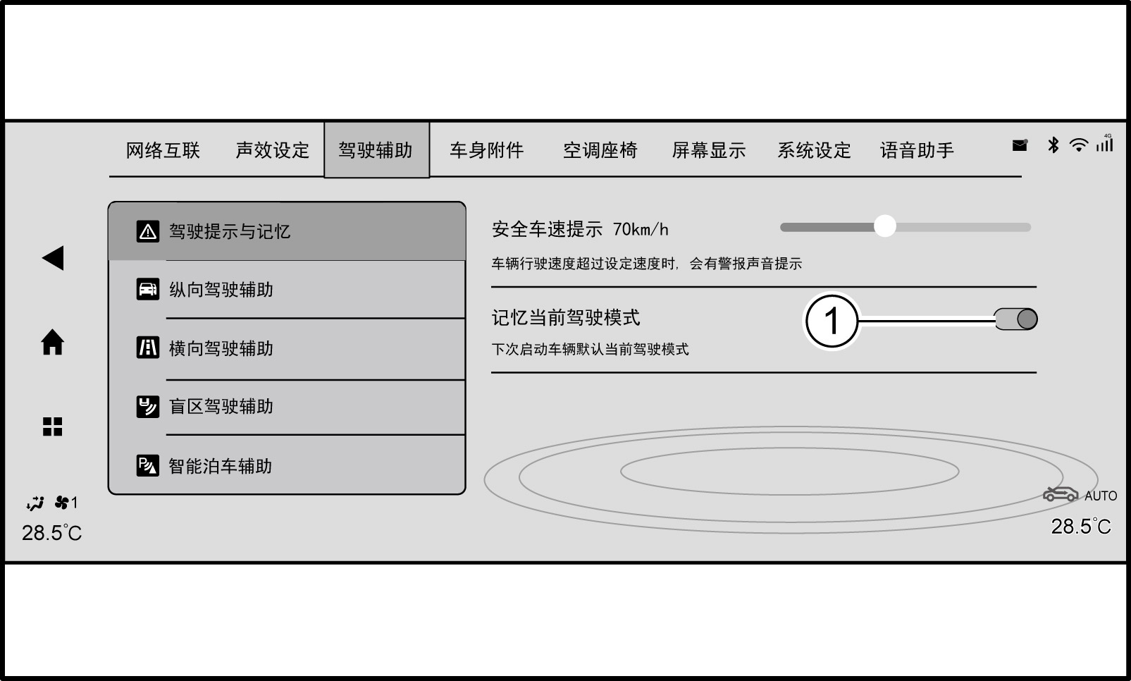用户进入驾驶模式界面后,点击“当前模式设置”进入驾驶模式设置,可设置当前驾驶模式下的相关参数。
