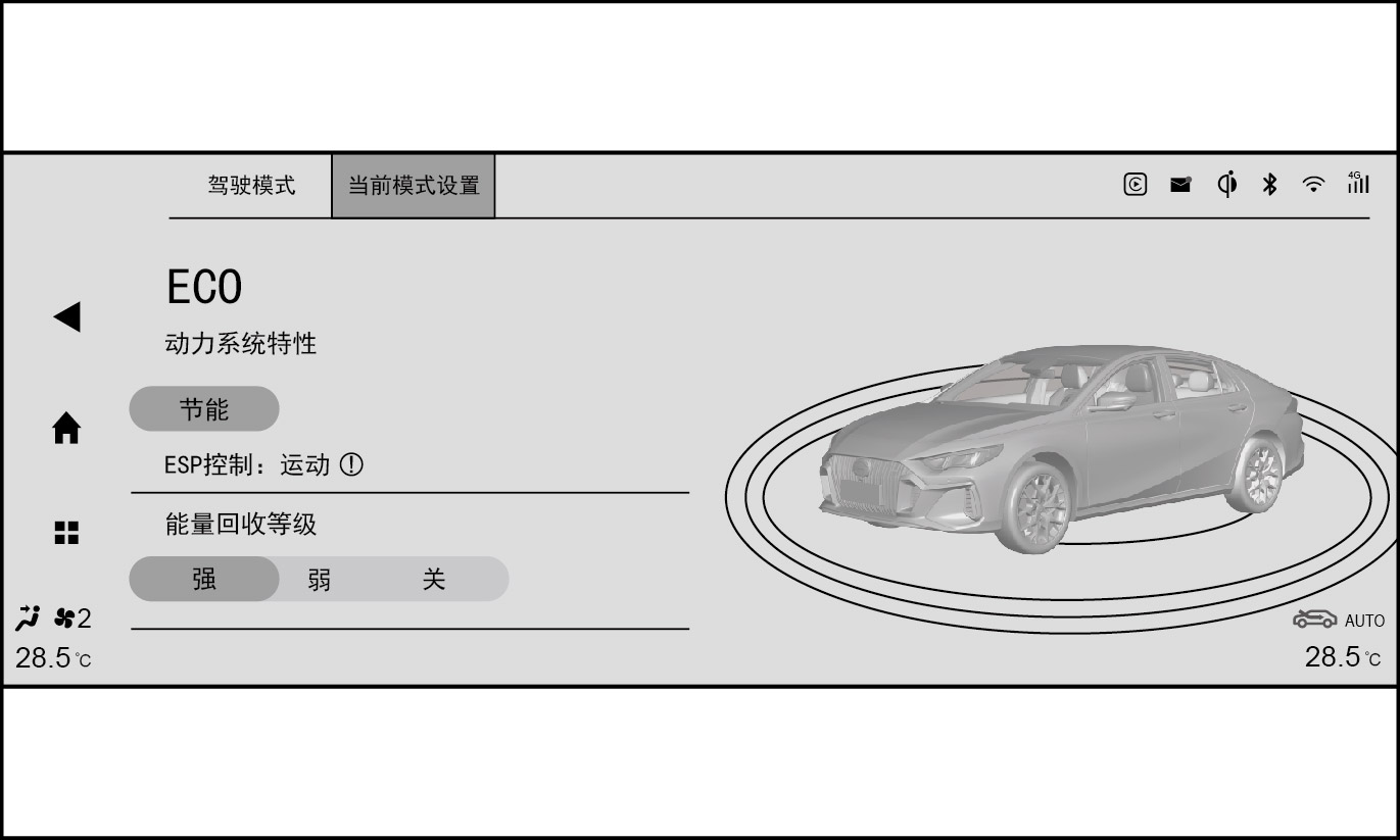 ,进入系统详细应用菜单界面,点击驾驶模式图标进入驾驶模式应用界面,点击软按键选定驾驶模式。