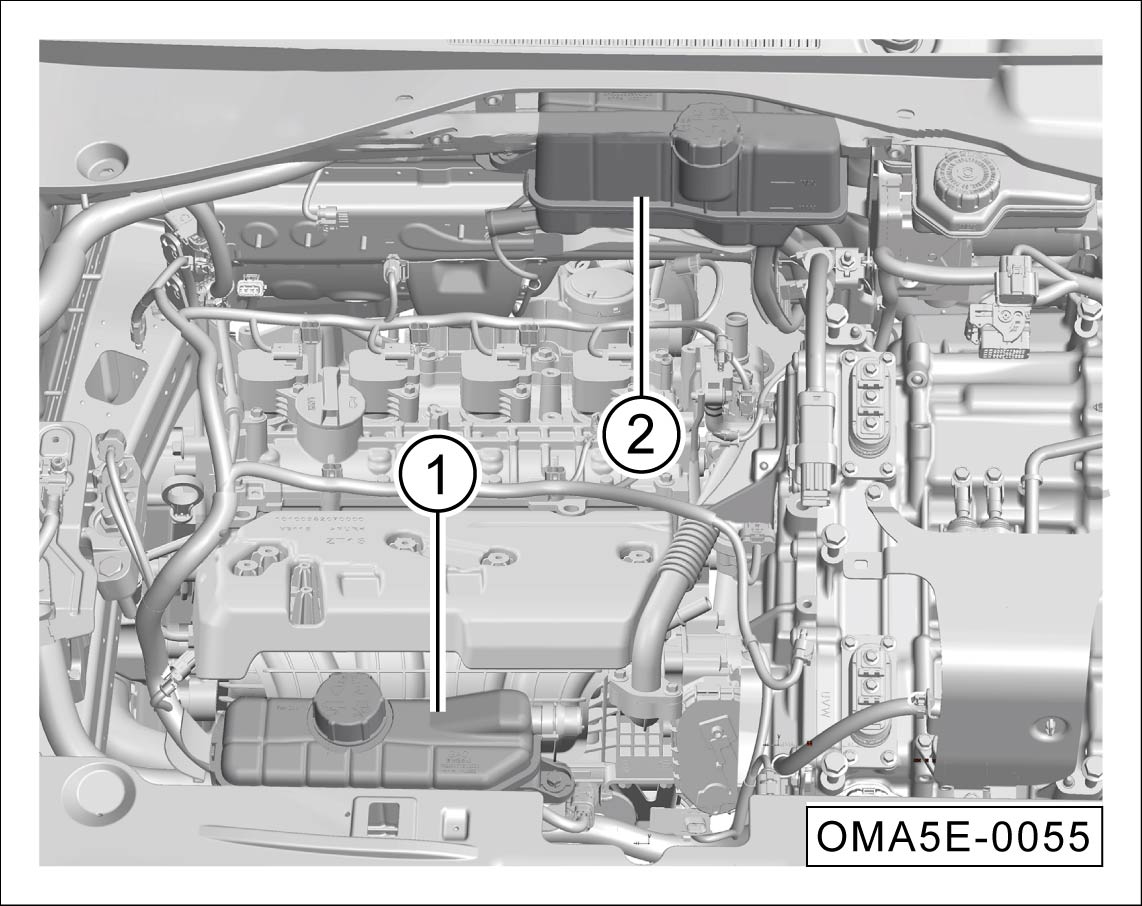 检查机电耦合系统和发动机膨胀罐内的冷却液液位是否在上限标记“MAX”与下限标记“MIN”之间。
