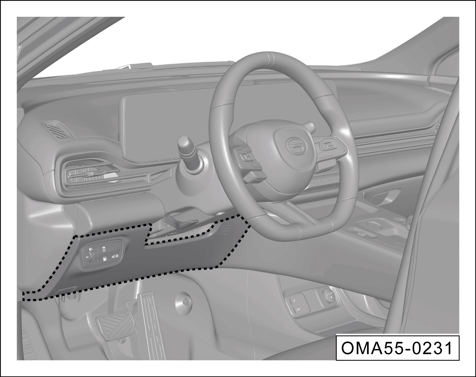 拆卸仪表板左侧下护板(虚线阴影部分),可见仪表板电器盒上面的保险丝。