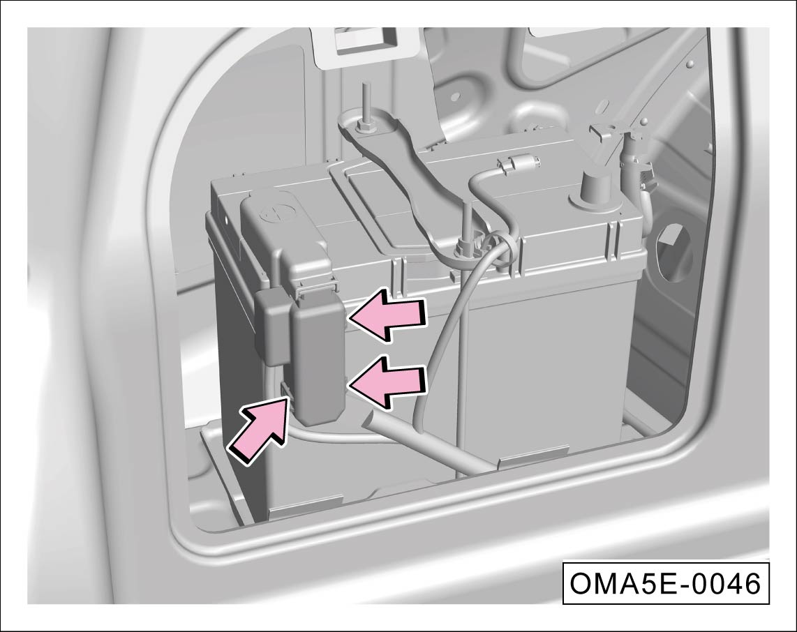向外撬开固定卡扣-箭头-,向上拉出电器盒盖,可见蓄电池电器盒上面的保险丝。
