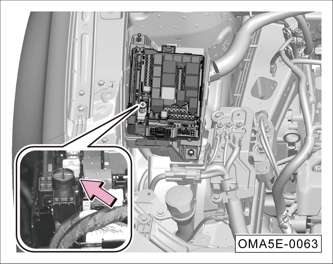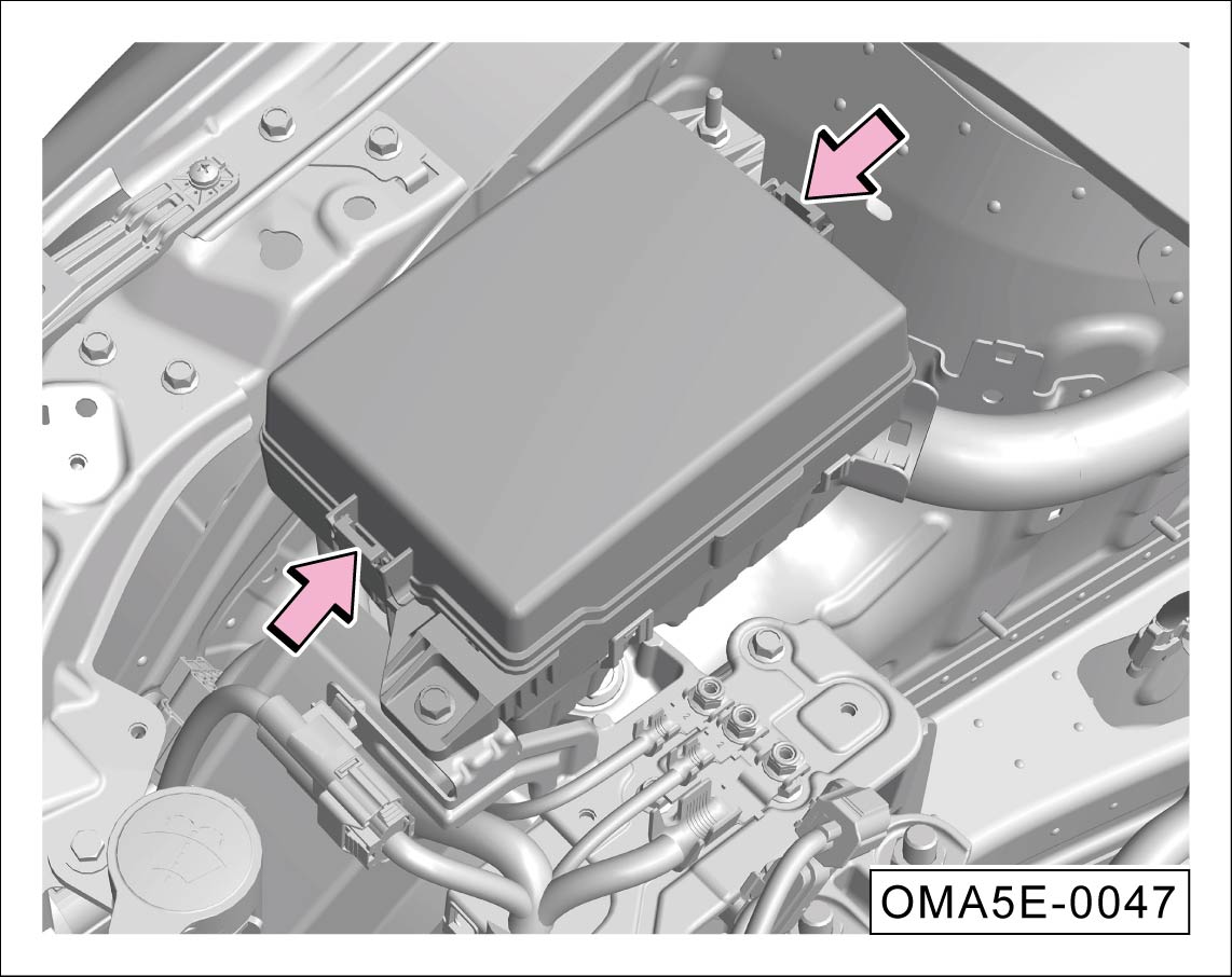打开前机舱盖,在前机舱右侧处找到保险丝盒,沿-箭头-方向按压固定卡扣,取下保险丝盒盖。