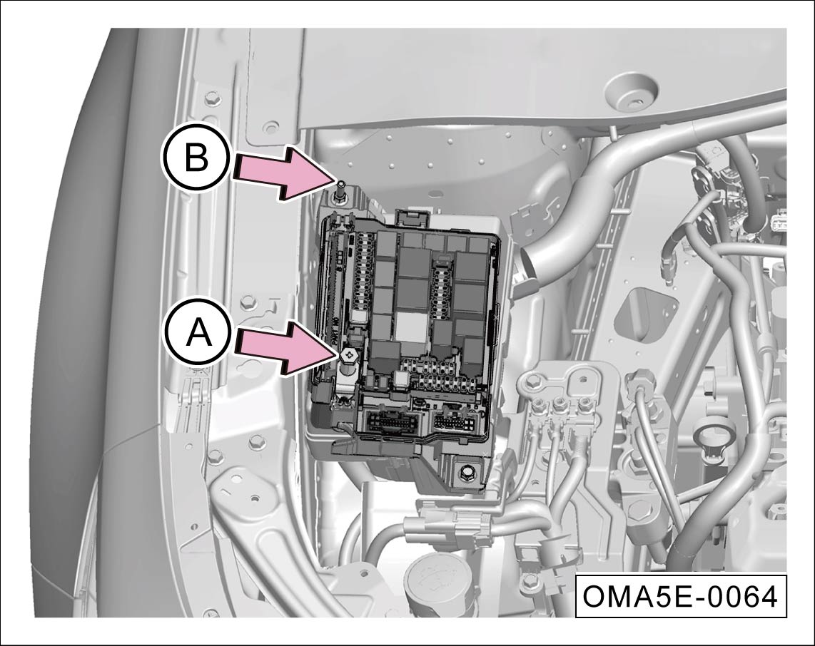 将正极跨接电缆的卡夹连接至本车专用跨接启动端子-箭头A-,另一端接另供电车辆蓄电池正极。将负极跨接电缆的卡夹连接至本车的-箭头B-,另一端接供电车辆蓄电池负极。