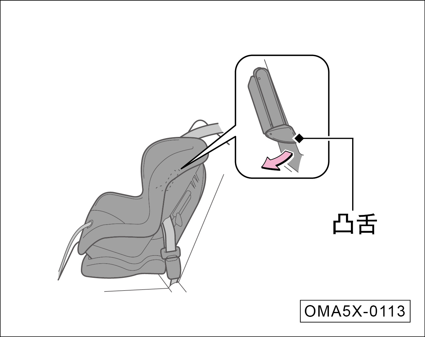 向下推凸舌,将肩部安全带穿过儿童安全座椅边上的狭缝。