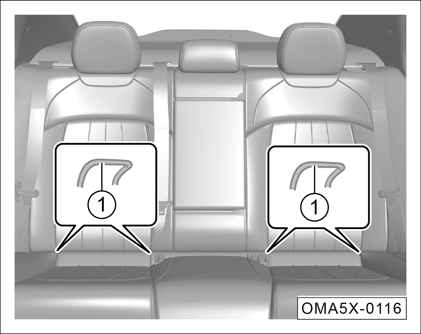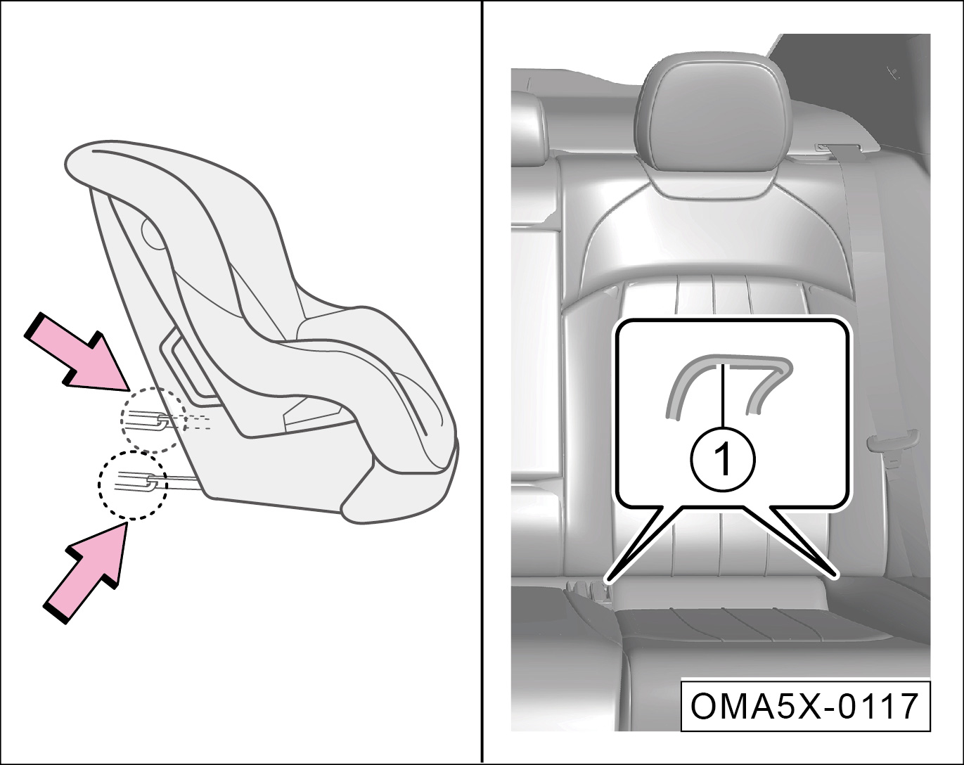 后排座椅的前固定点①隐藏在其靠背与座垫的缝隙内。