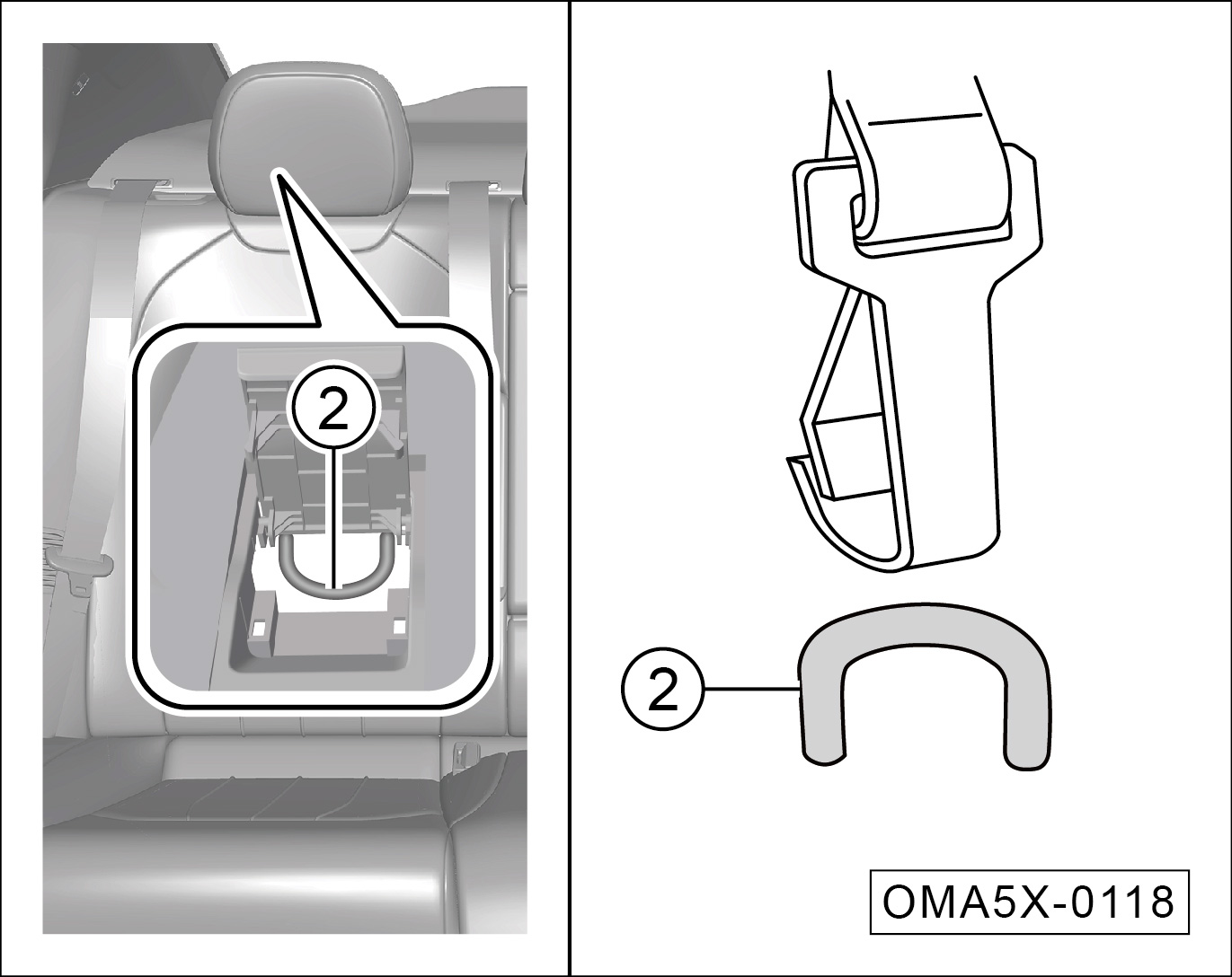 将紧固带穿过头枕支柱,掀开后固定点②的保护盖,并将紧固带钩勾住后固定点②,确保紧固带未扭曲。