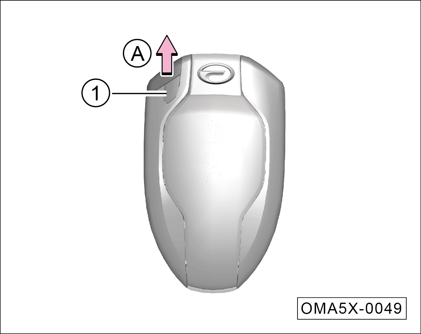 按压锁止按键①,同时沿-箭头A-方向取出应急机械钥匙。