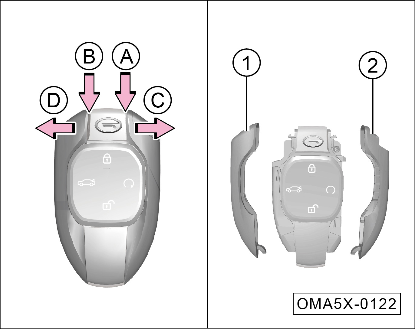 取下遥控钥匙镀铬外壳①和②。