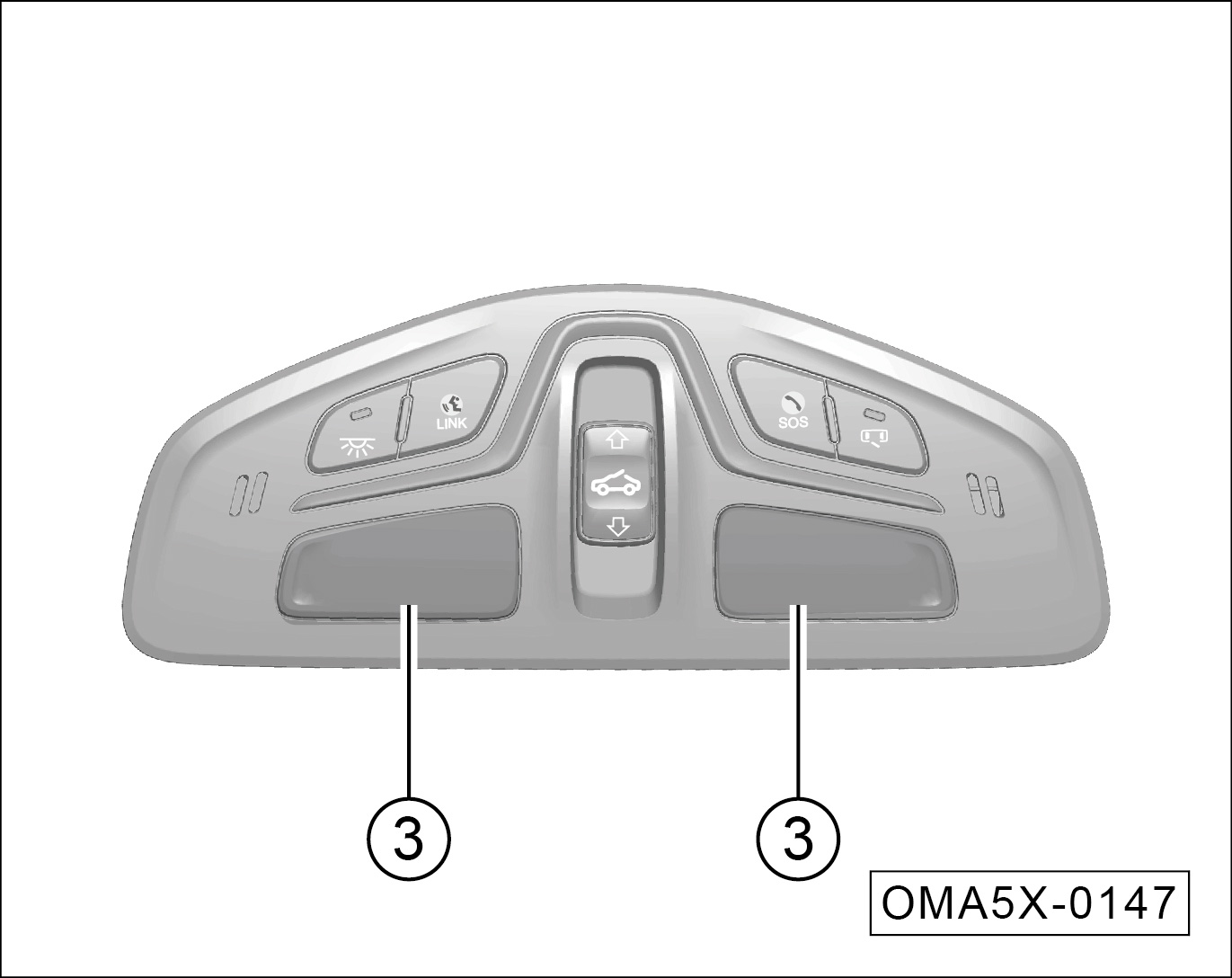 前排车顶照明灯熄灭时,按一下前车顶照明灯③,对应侧的前车顶照明灯点亮;再按一下前车顶照明灯③,对应侧的前排车顶照明灯熄灭。