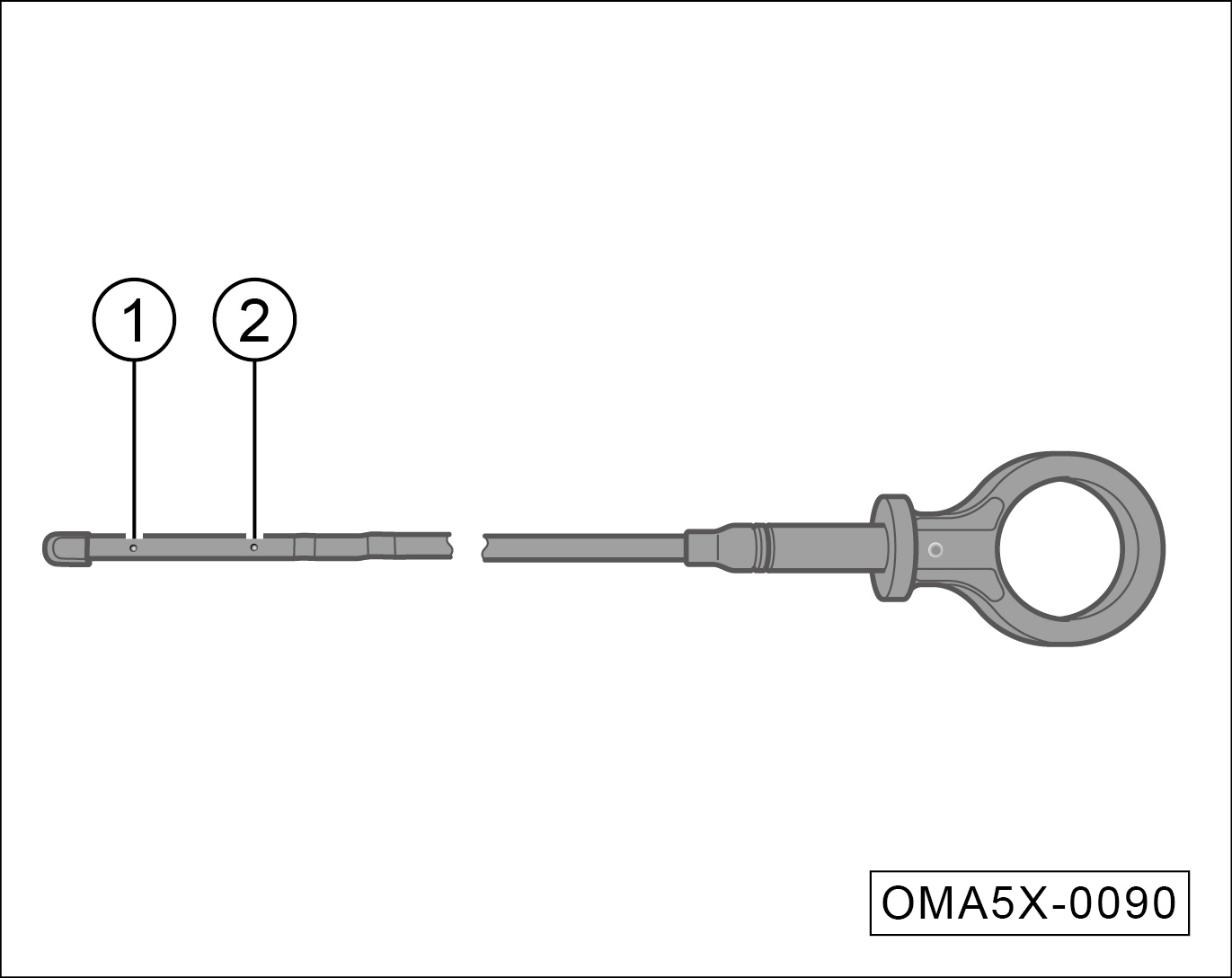 再次拉出机油标尺,读取测得的油位:油位应位于机油下限标记①与机油上限标记②之间。