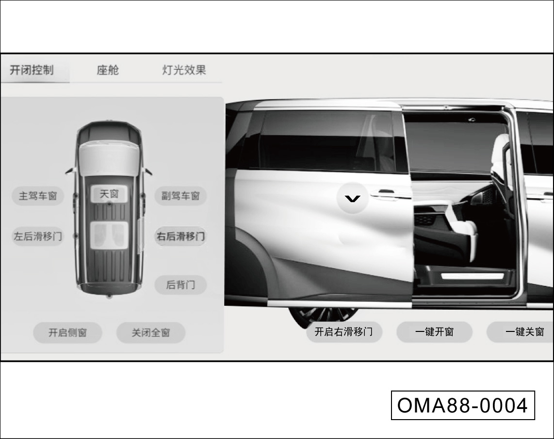 当滑移门电动功能开启时,按压后排中控面板按键,对应侧电动滑移门将进行电动开启或关闭。
