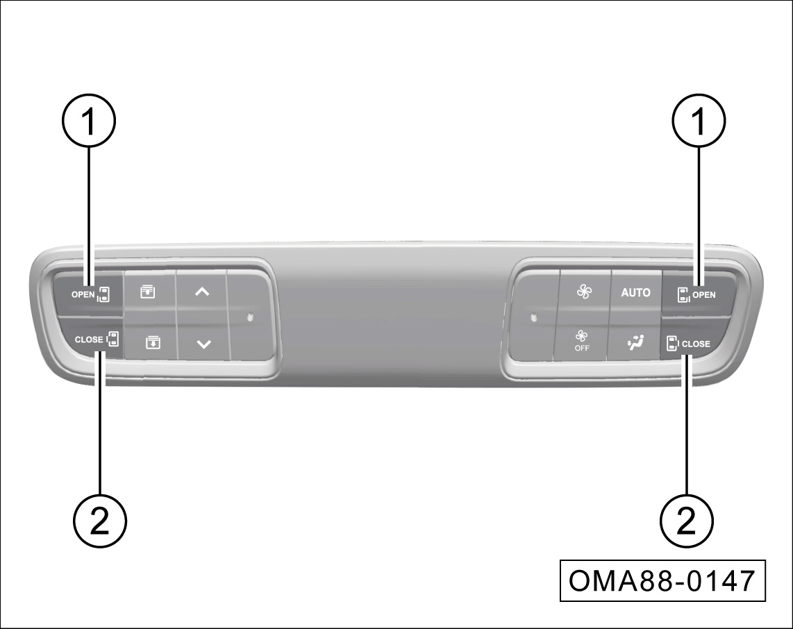 在滑移门全开状态下,长按按键①,电动关闭对应侧滑移门。