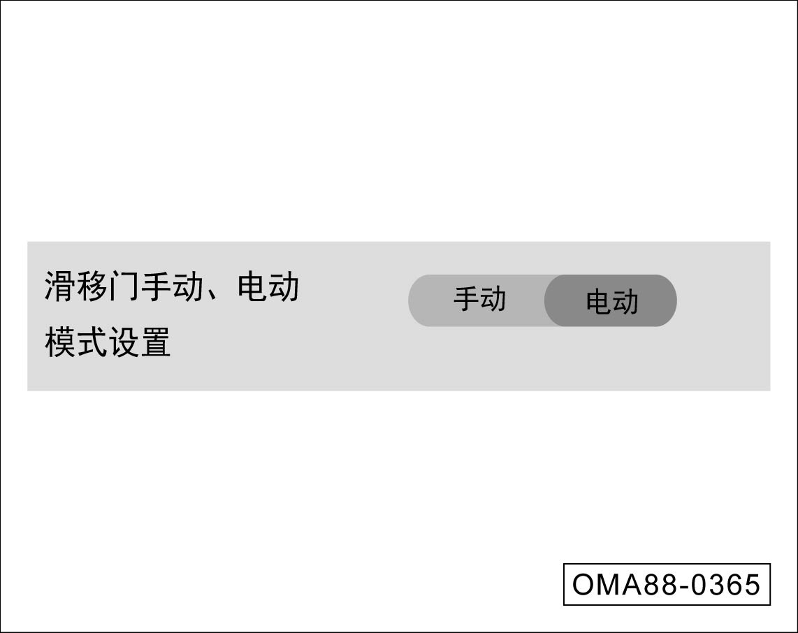 整车电源在“ON”挡位,通过音响系统“设置→车身附件→门窗锁→滑移门手动、电动模式设置”,可设置滑移门手动或电动开启,系统默认滑移门电动开启。