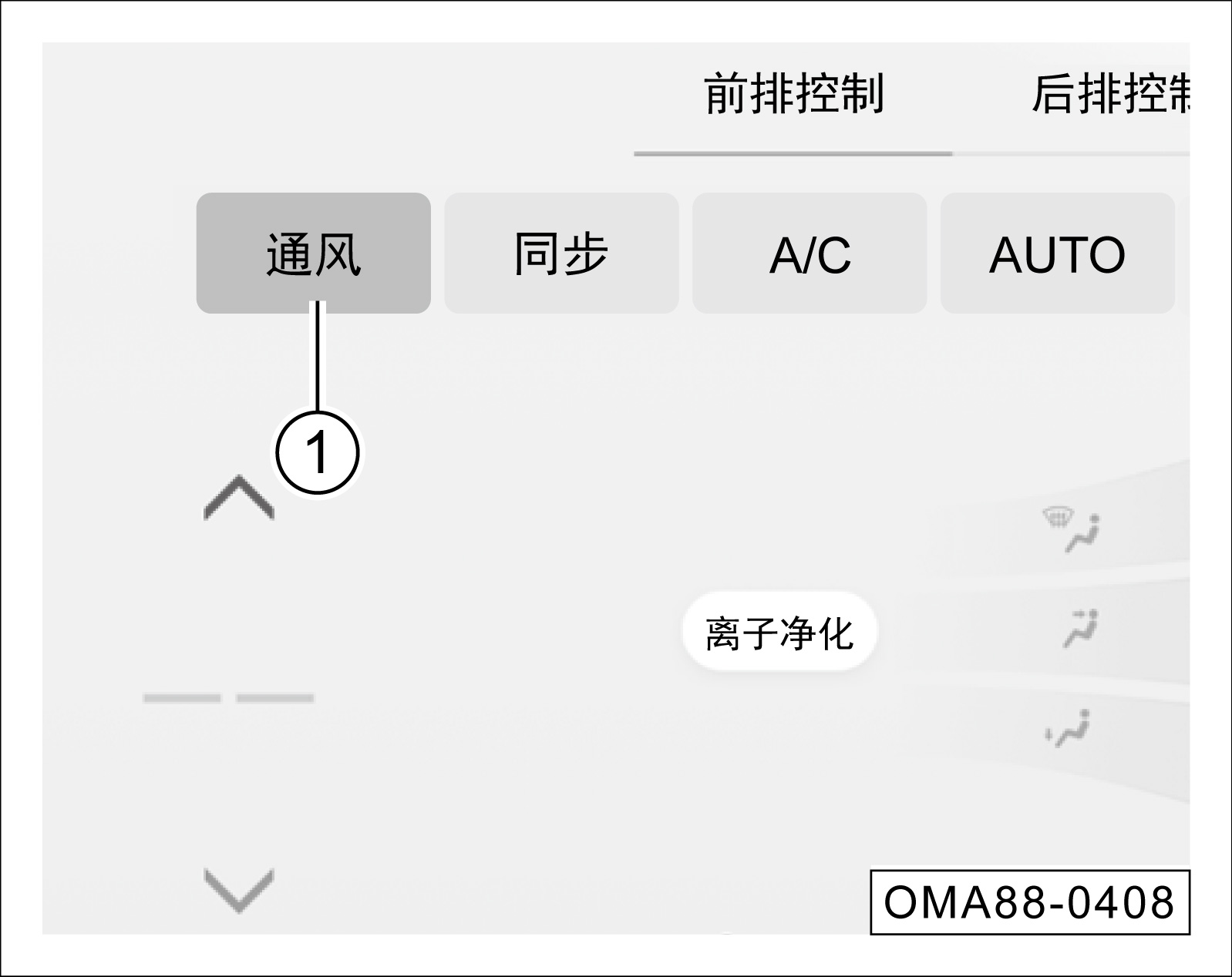 点击音响系统空调控制界面“通风”软按键①,开启通风模式。