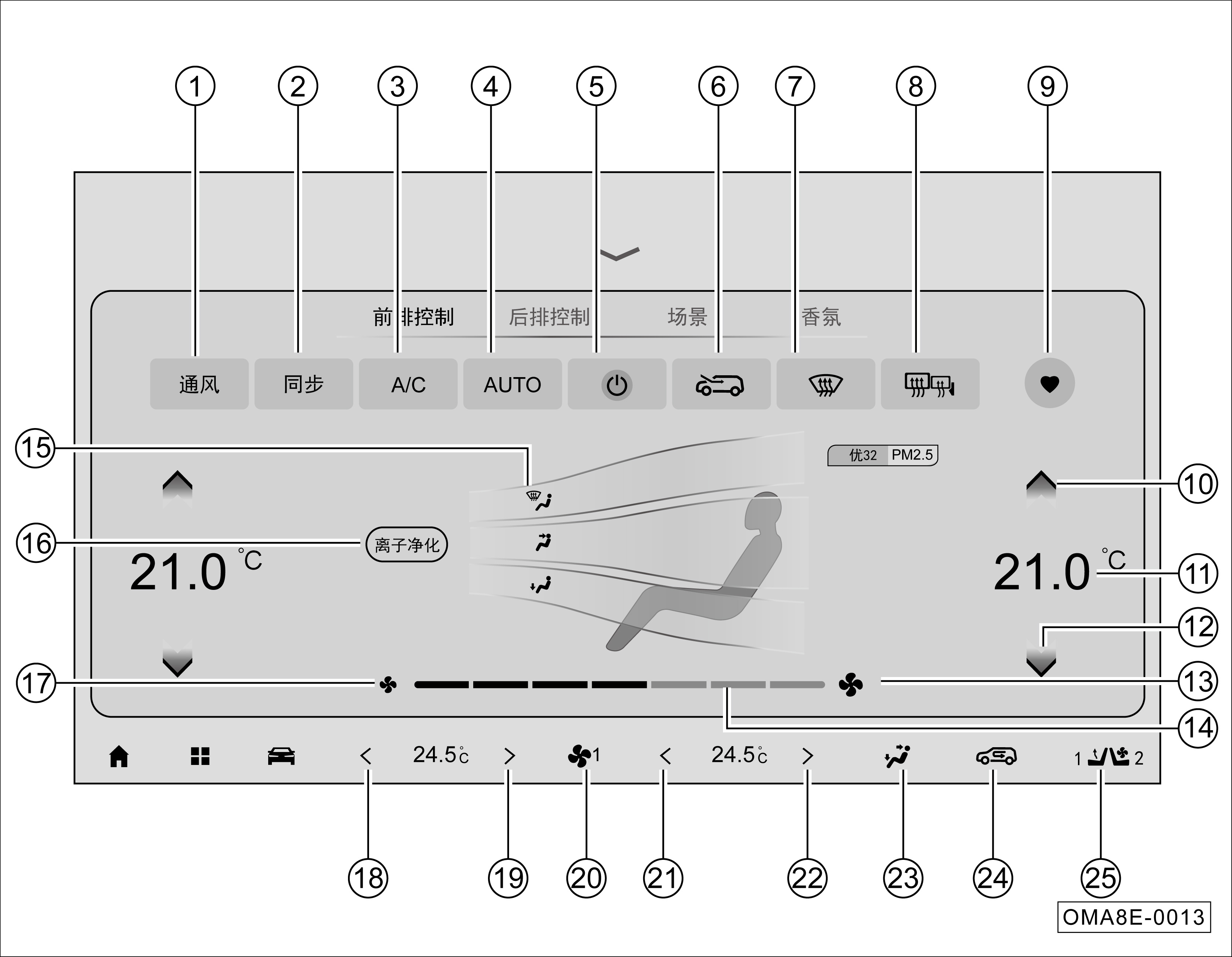 软按键、AUTO软按键、“离子净化”软按键、按压后排中央控制面板AUTO按键、