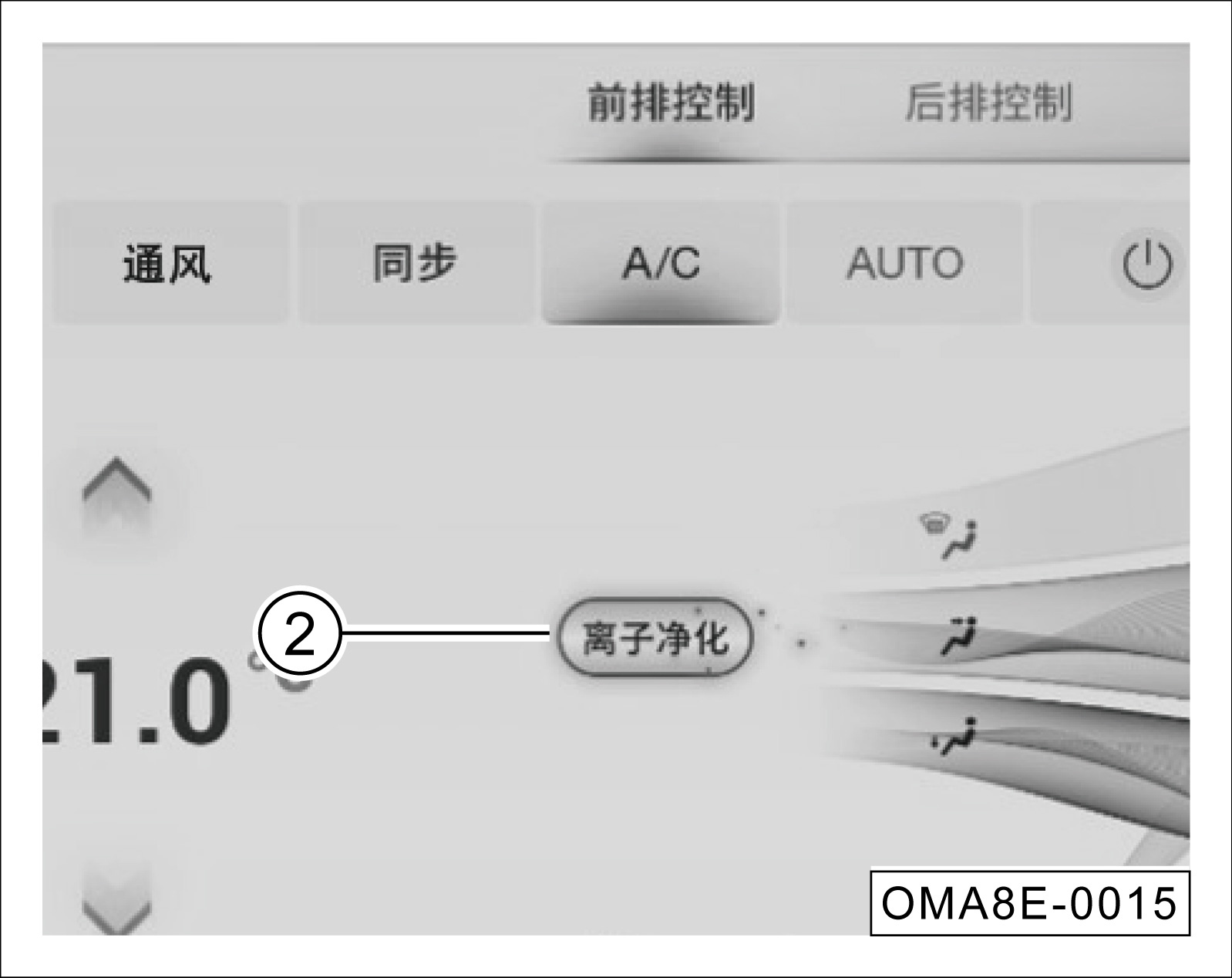点击音响系统空调控制界面“离子净化”软按键②,开启等离子空气净化器。可以产生等离子,有效分解车内甲醛、苯等有害气体,净化车内空气。