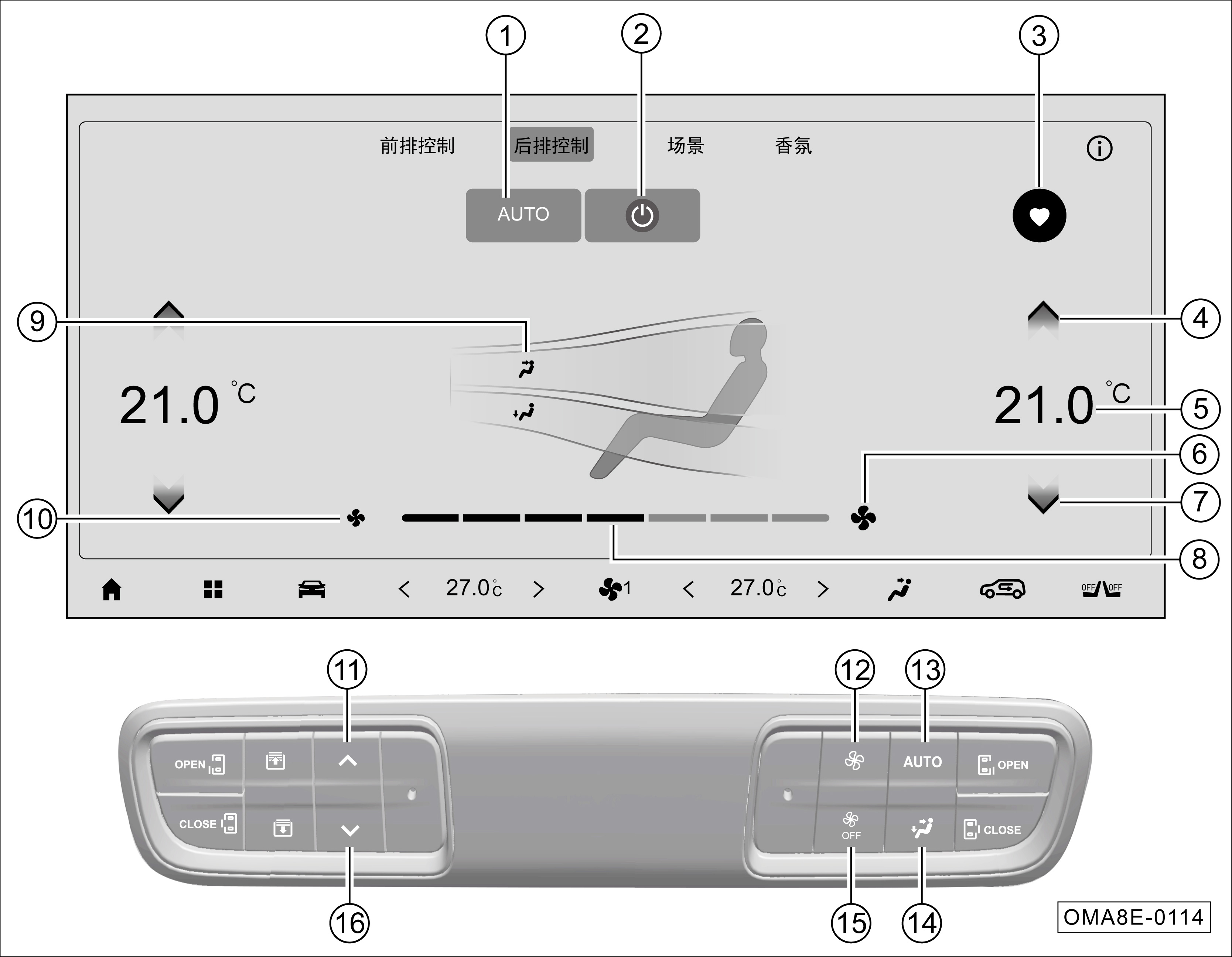 后排中央控制面板温度设定按键、音响系统后空调界面温度设定软按键均可用于设定后排温度,该温度值同步在后空调面板的液晶显示屏、后排中央控制面板显示屏上显示。