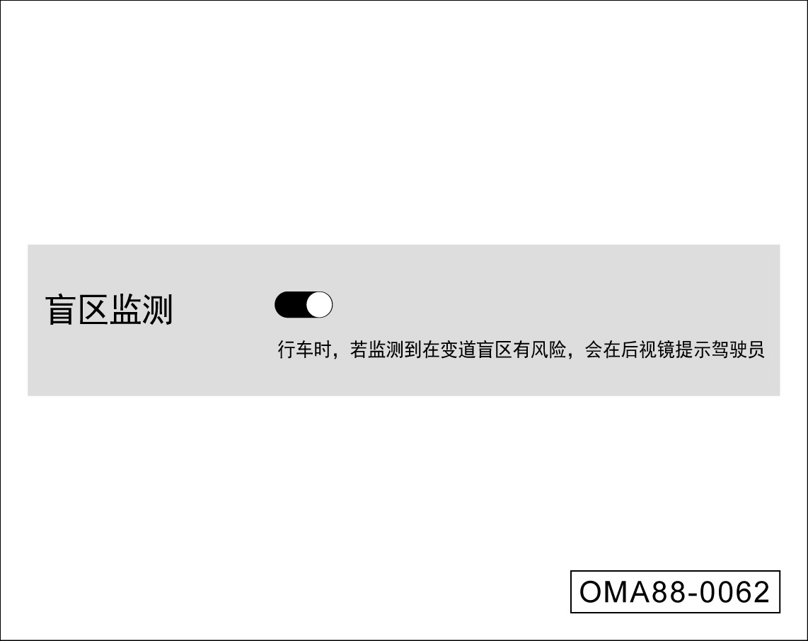整车电源在“ON”挡位,进入音响系统“设置→ADiGO智能驾驶→ADiGO主动安全辅助”界面,点击“盲区监测”右侧
