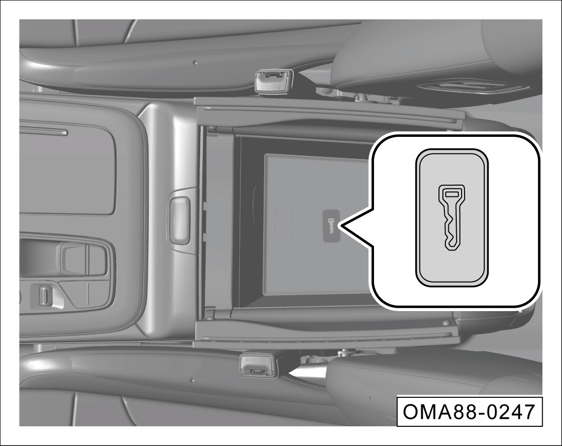 若由于智能遥控钥匙电池电量低,组合仪表显示屏提示“未检测到钥匙”时,可以把智能遥控钥匙水平放在前排扶手箱底部钥匙标记处,然后按启动开关切换到“ACC”或“ON”挡位,或踩下制动踏板,启动开关背光灯变为绿色后,按下启动开关,组合仪表显示屏“READY”指示灯点亮,车辆启动。