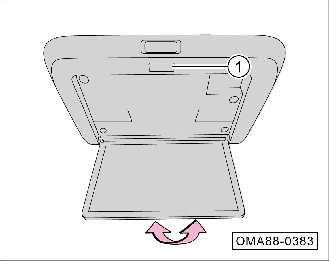 整车电源在“ON”挡位,按压按键①,智慧屏往下弹出一小段距离,手动打开智慧屏,智慧屏自动开机;合上智慧屏直至听到“咔嗒”扣合声,智慧屏自动关机。