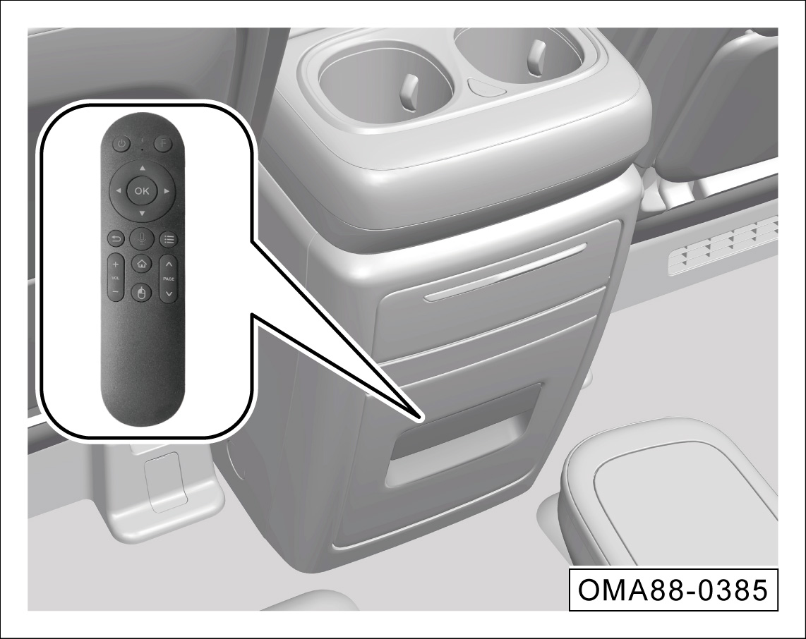 拉开前排座椅中央扶手箱后储物格,可见智慧屏遥控器。