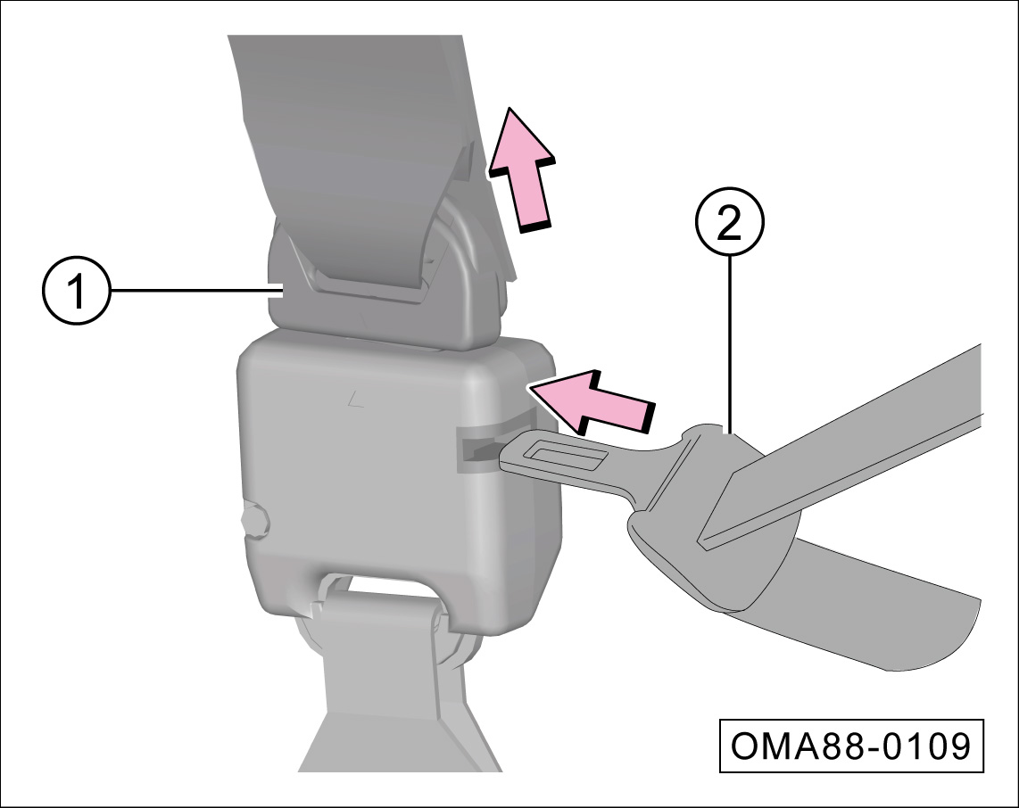 从车顶的固定槽中拉出安全带小锁舌①和锁舌②。
