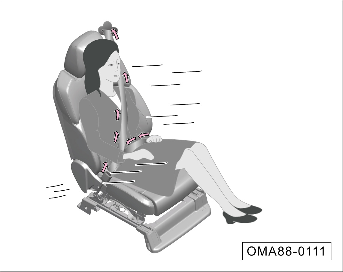 平行于上身向上拉安全带的肩带部分,张紧髋部安全带,并确保锁舌正确啮合。