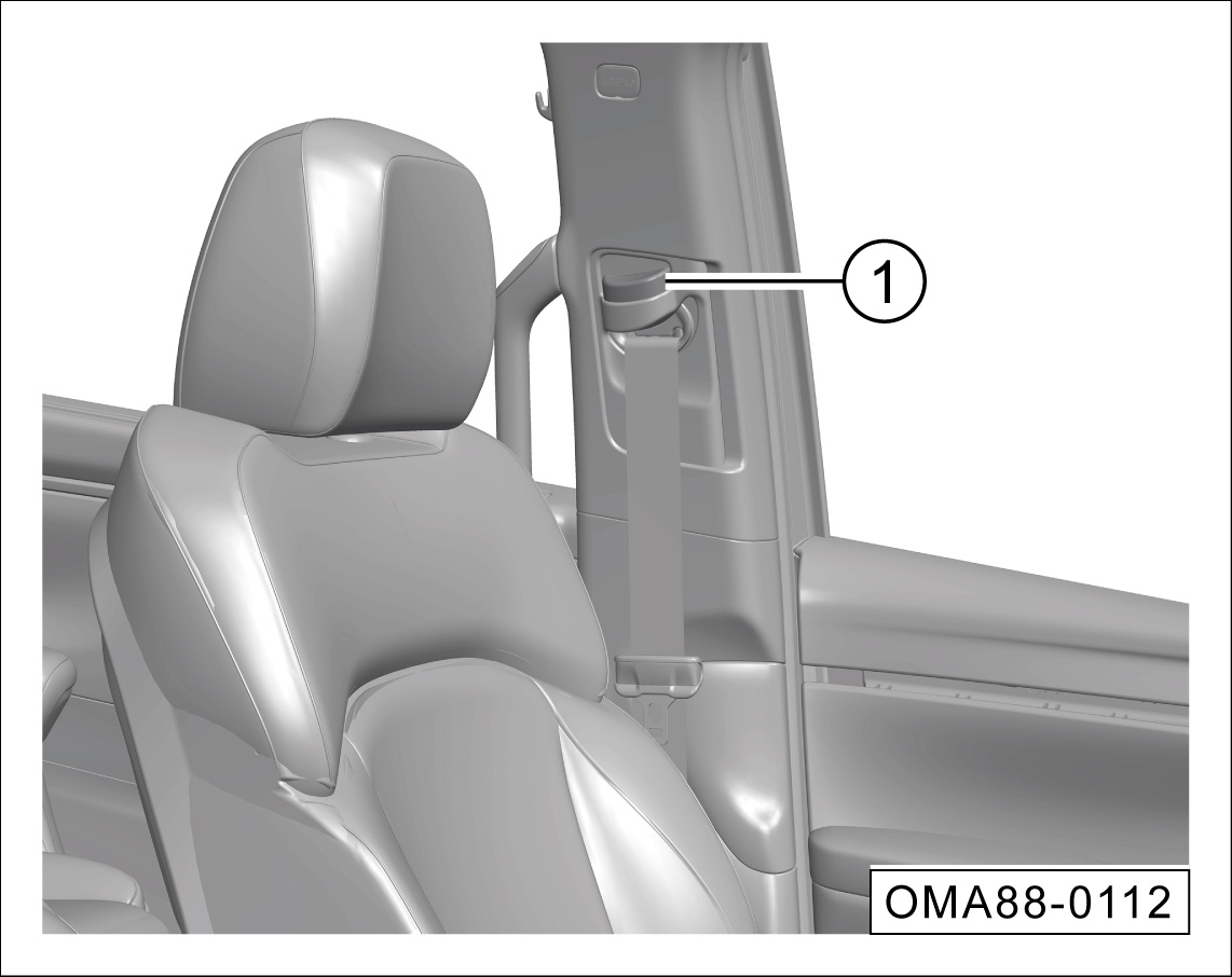 下移:按压导向件解锁开关①并向下移动,将肩部安全带调整至合适高度。