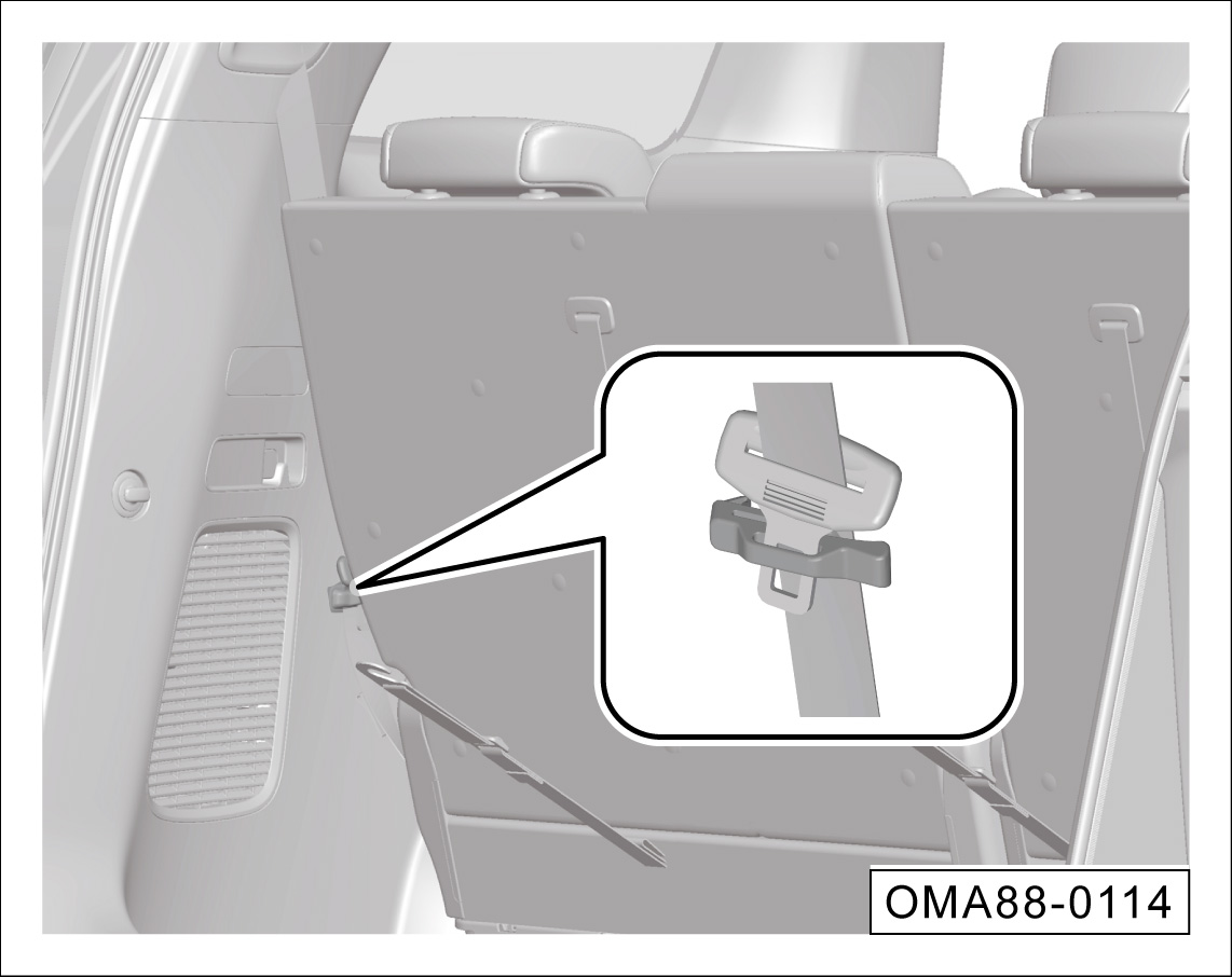 佩戴第三排两侧座椅安全带时,应先将安全带卡扣从饰板卡夹中拔出,然后移动安全带织带滑出卡夹,再拉动安全带佩戴,避免因拉动安全带而损坏卡夹。