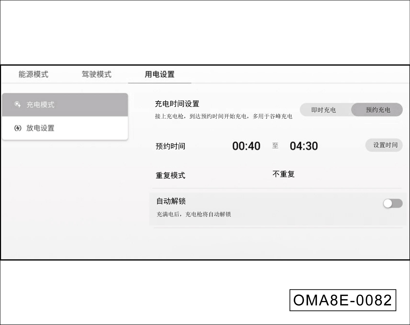 可通过音响系统应用菜单“能量管理→用电设置→充电模式”选择“即时充电”或“预约充电”。当用户选择预约充电并设置预约时间,接上充电枪后,到达预约时间即开始充电。