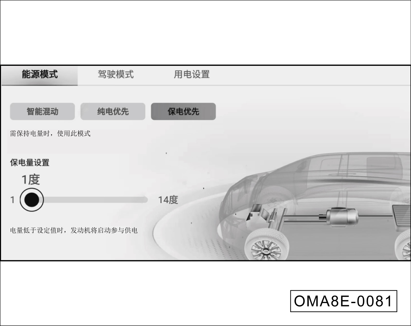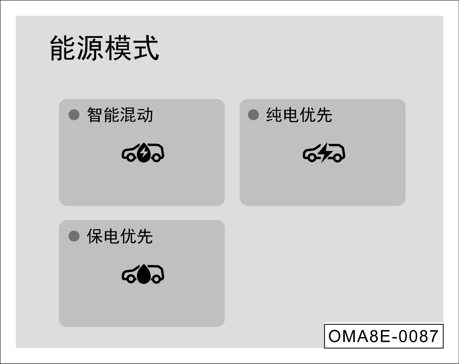 点击音响系统应用菜单中的“能量管理”图标,进入能量管理设置界面。包含能源模式、驾驶模式 挡位说明 、用电设置三部分。