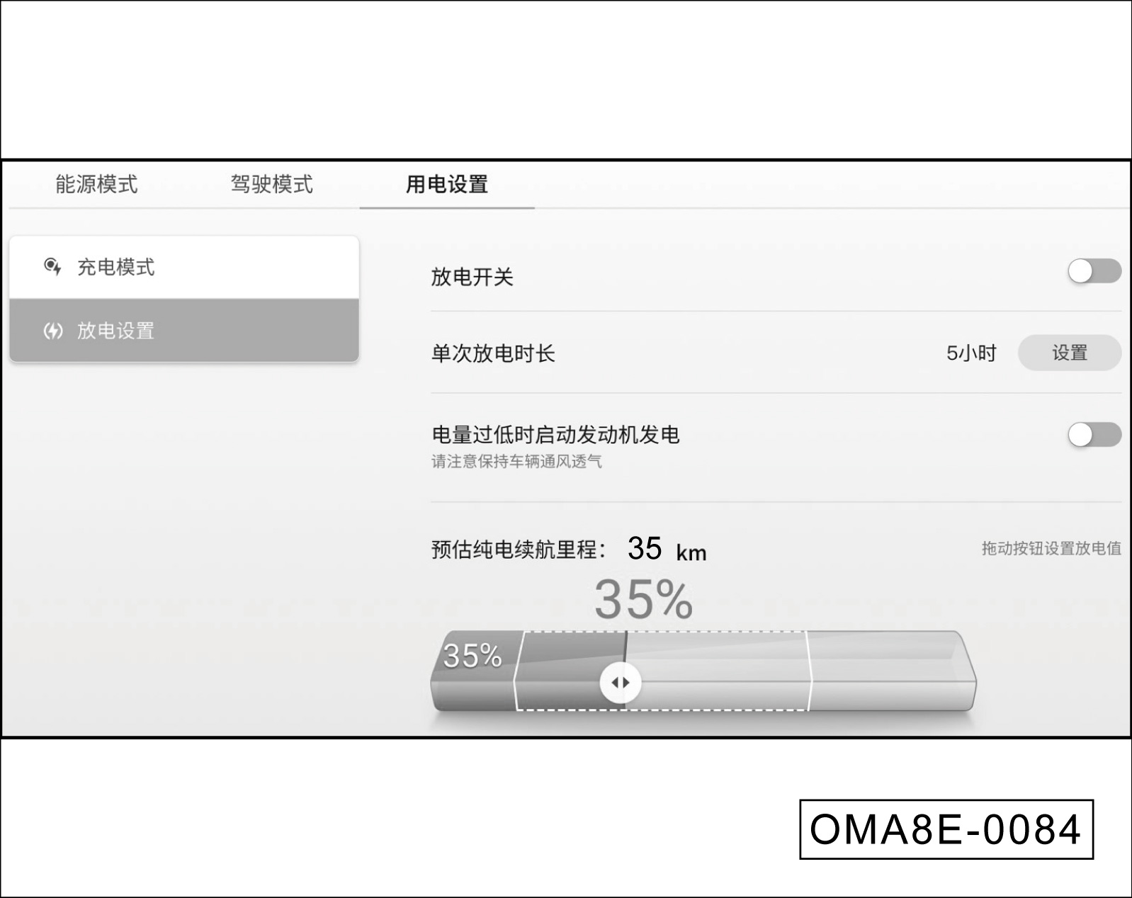 车辆电量较低时,对外放电功能存在不能开启或停止对外放电的可能,请在音响系统中打开“电量过低时启动发动机发电”开关。