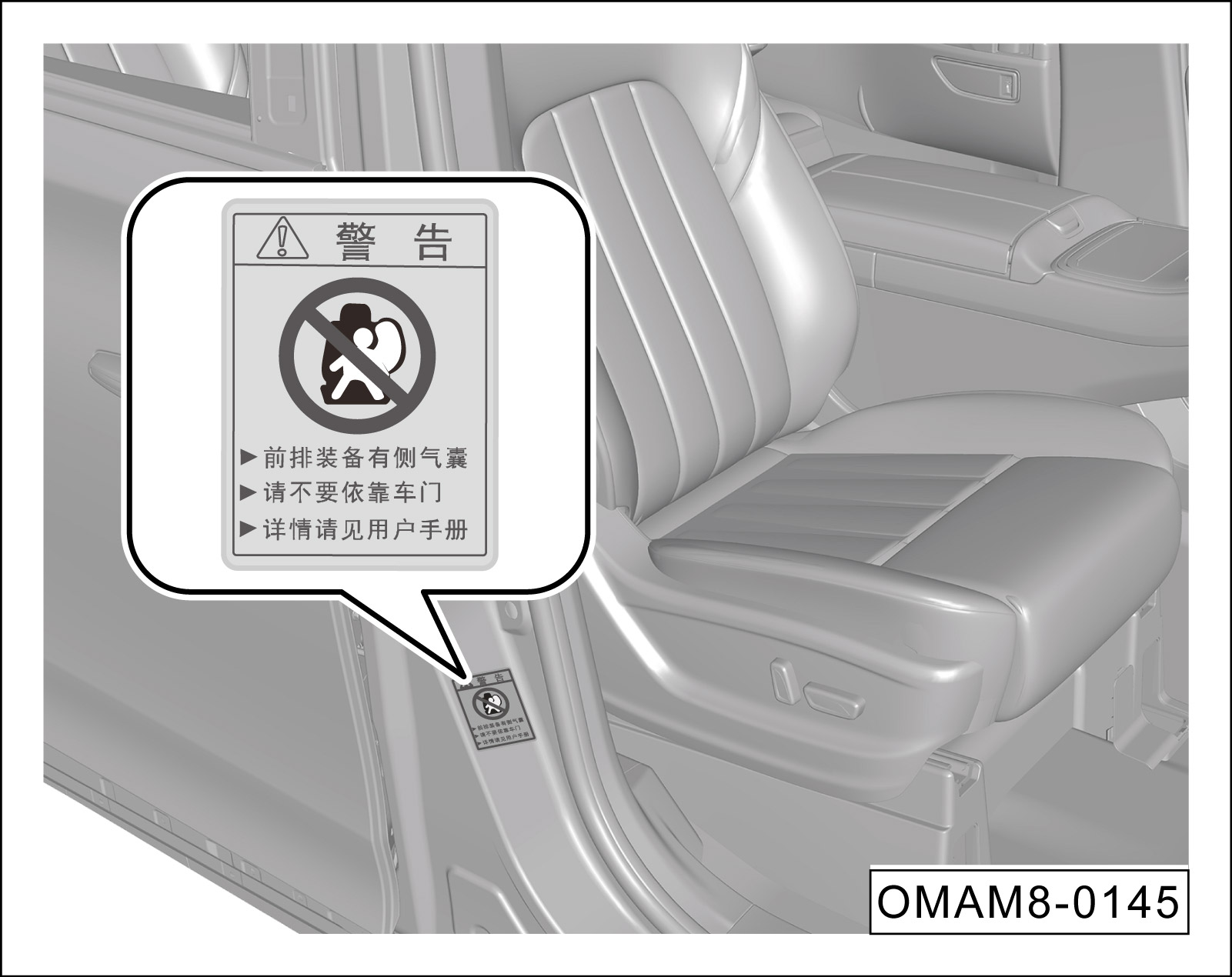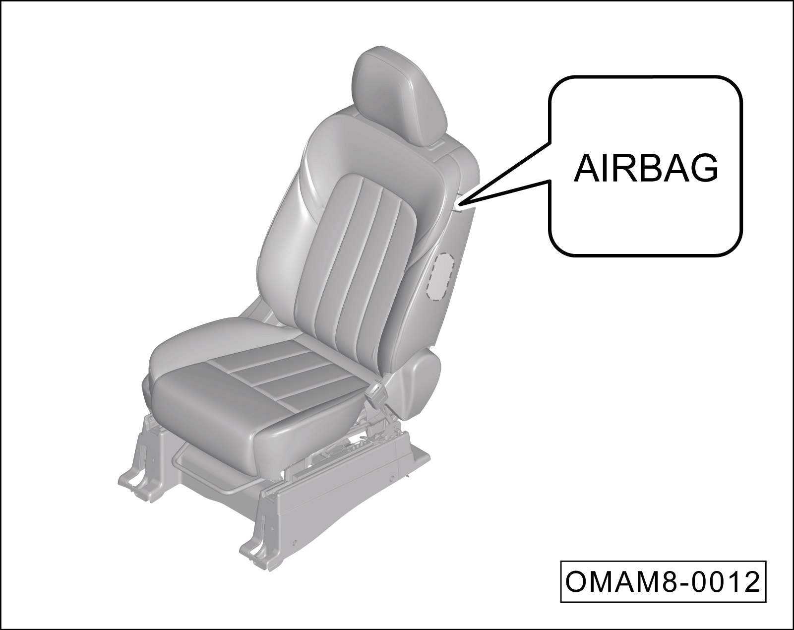 前排侧面安全气囊安装在驾驶员座椅及前排乘员座椅靠背向门侧内部(虚线阴影部分),“AIRBAG”为安全气囊标志。