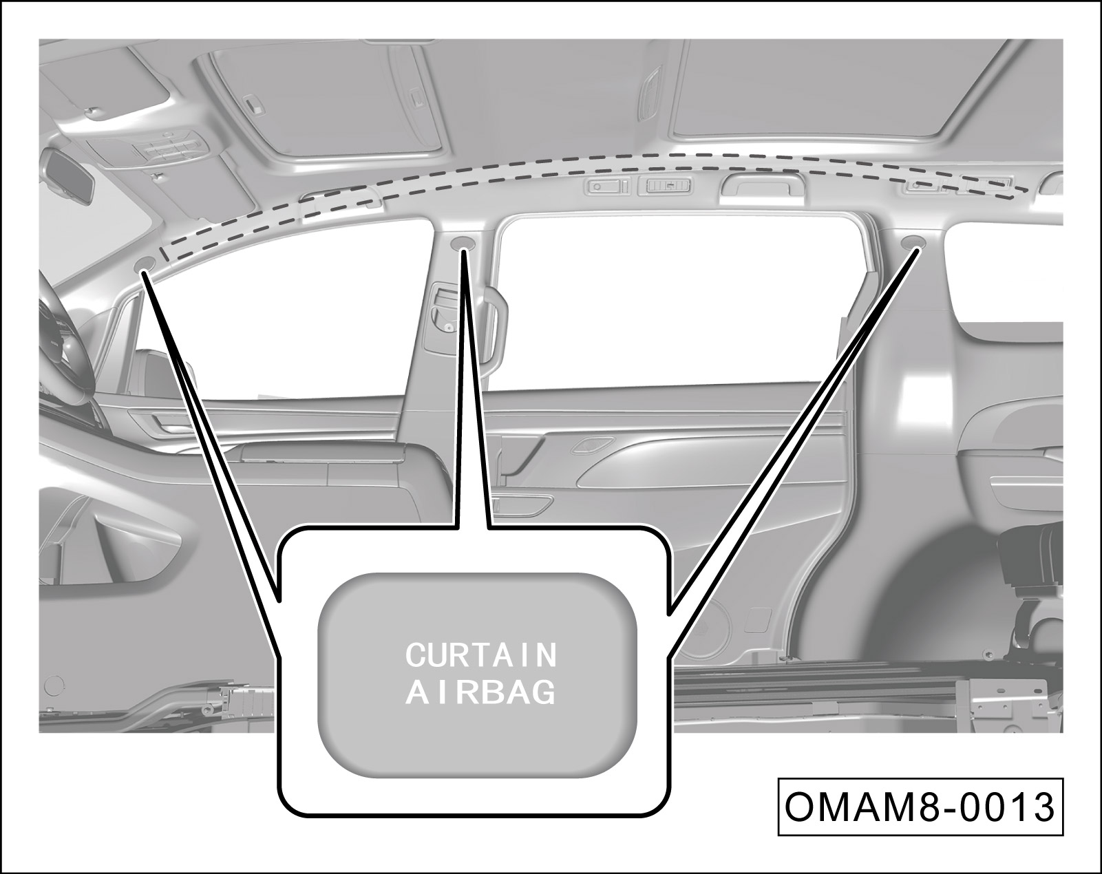 侧窗帘式安全气囊安装在顶棚左、右两侧内部(虚线阴影部分),“CURTAIN AIRBAG”为安全气囊标志。
