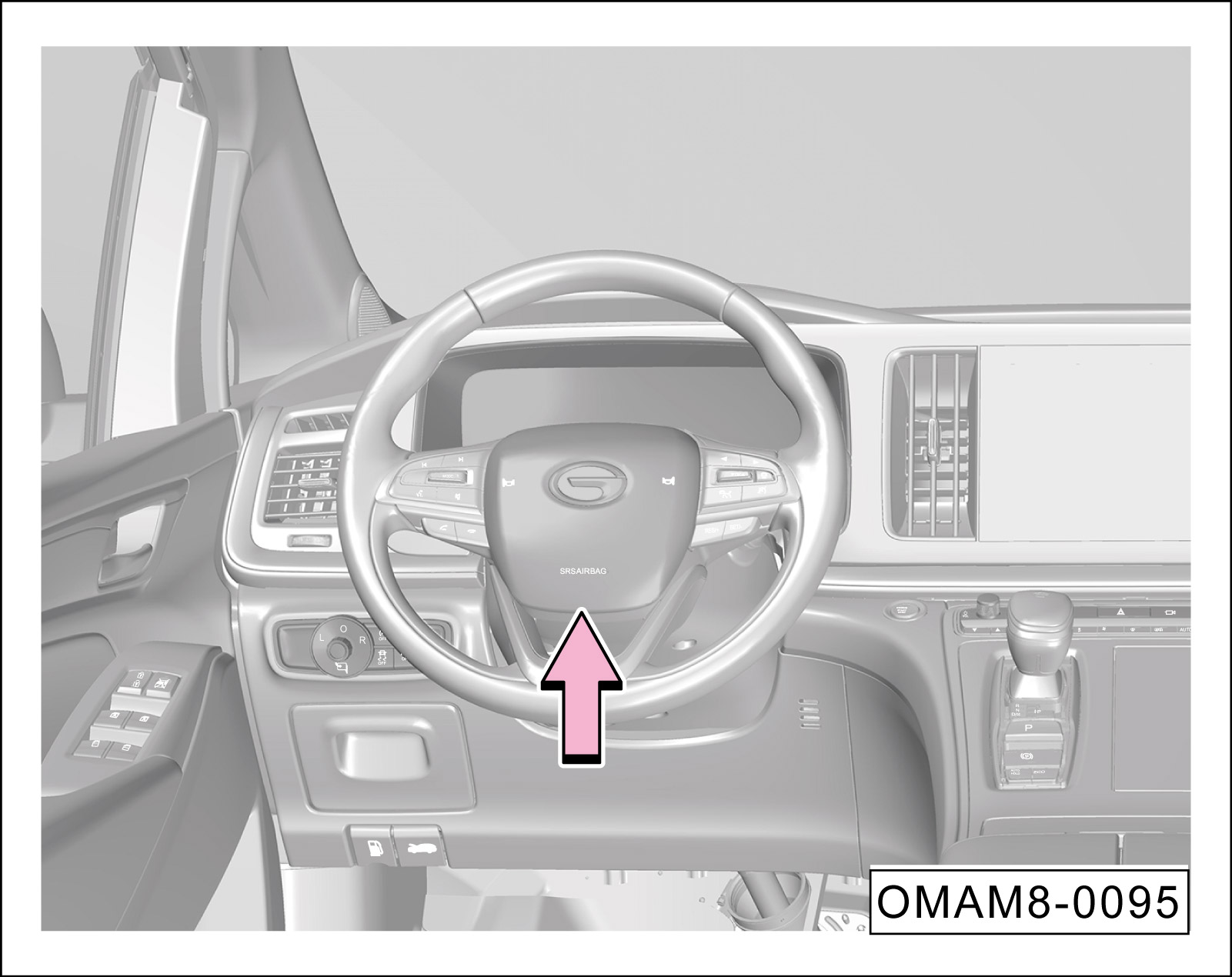 驾驶员正面安全气囊安装在方向盘内部(阴影部分),“SRS AIRBAG”为安全气囊标志。
