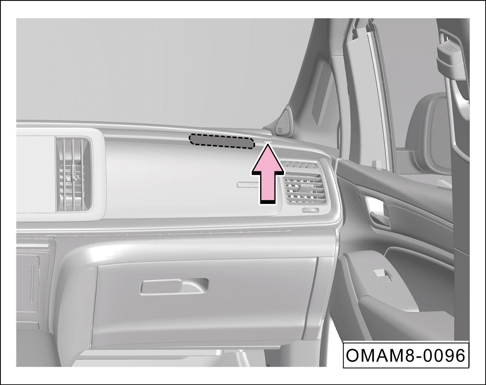 前排乘员正面安全气囊安装在仪表台内部(虚线阴影部分),“AIR BAG”为安全气囊标志。