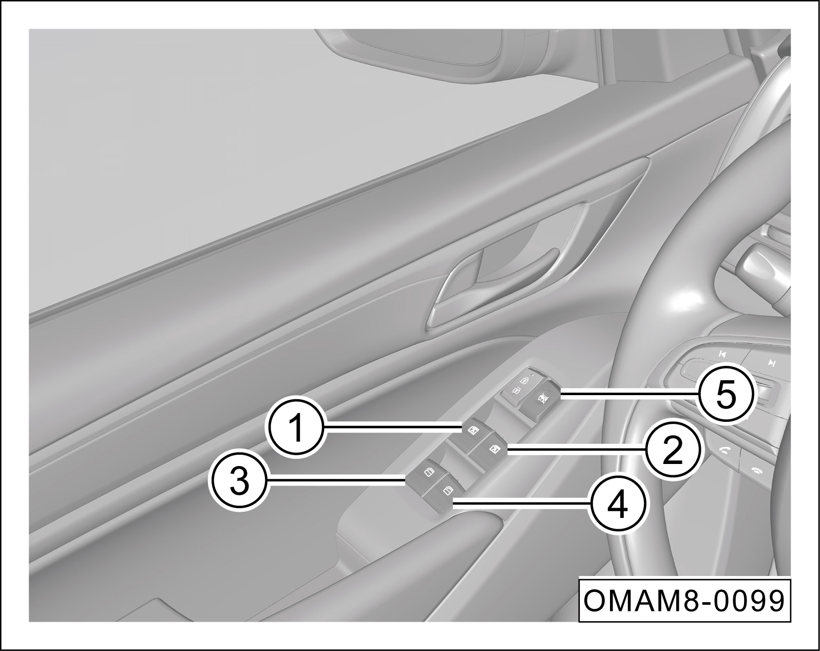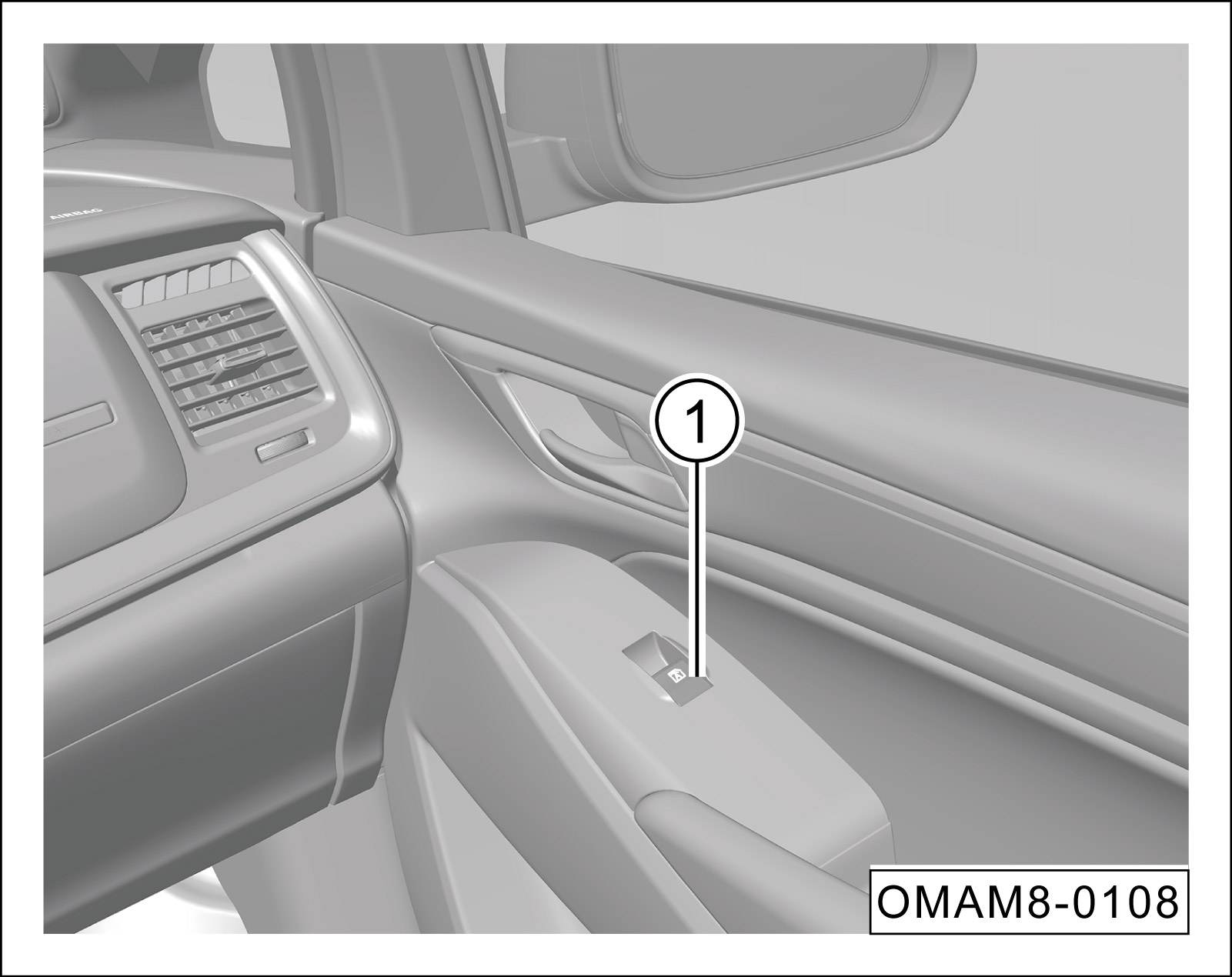 上提按键①,电动车窗将向上关闭,直到松开按键或者车窗上升至最高位置。