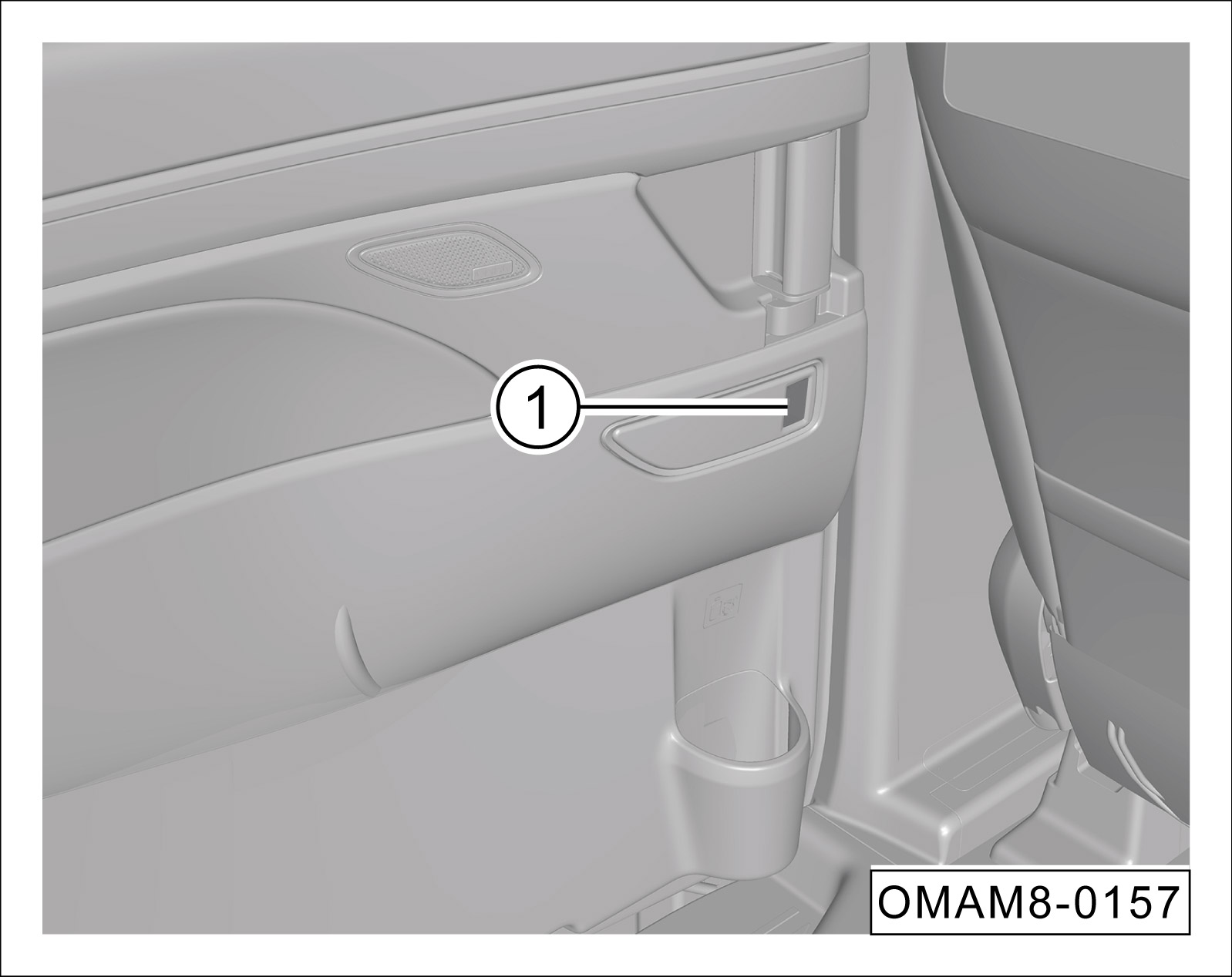 按下按键①到第一个停止位置,电动车窗将向下打开,直到松开按键或者车窗下降至最低位置。