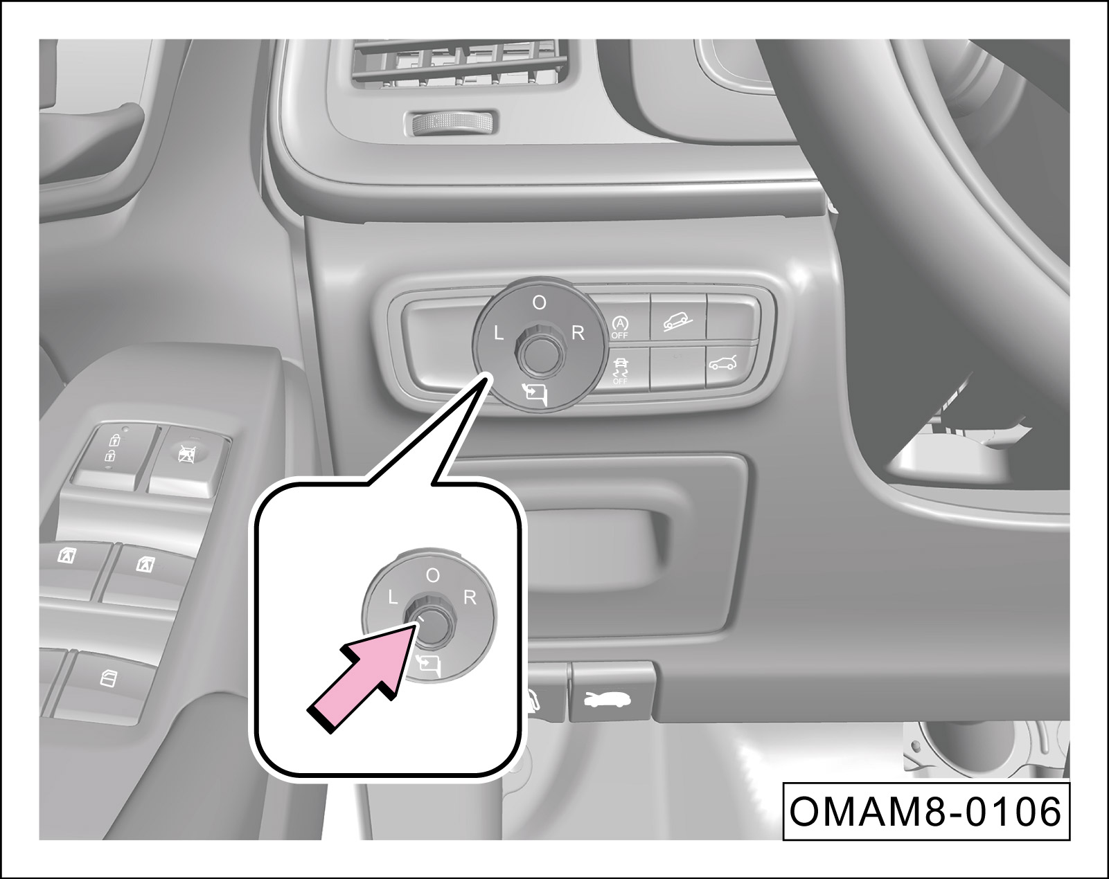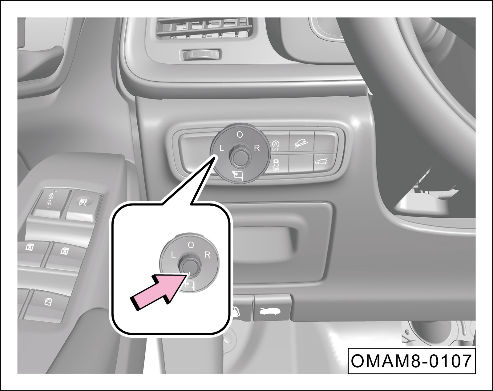 手动倒车下翻功能与外后视镜选择开关 “L”、“O”、“R”关联,自动倒车下翻功能与外后视镜选择开关没有关联。