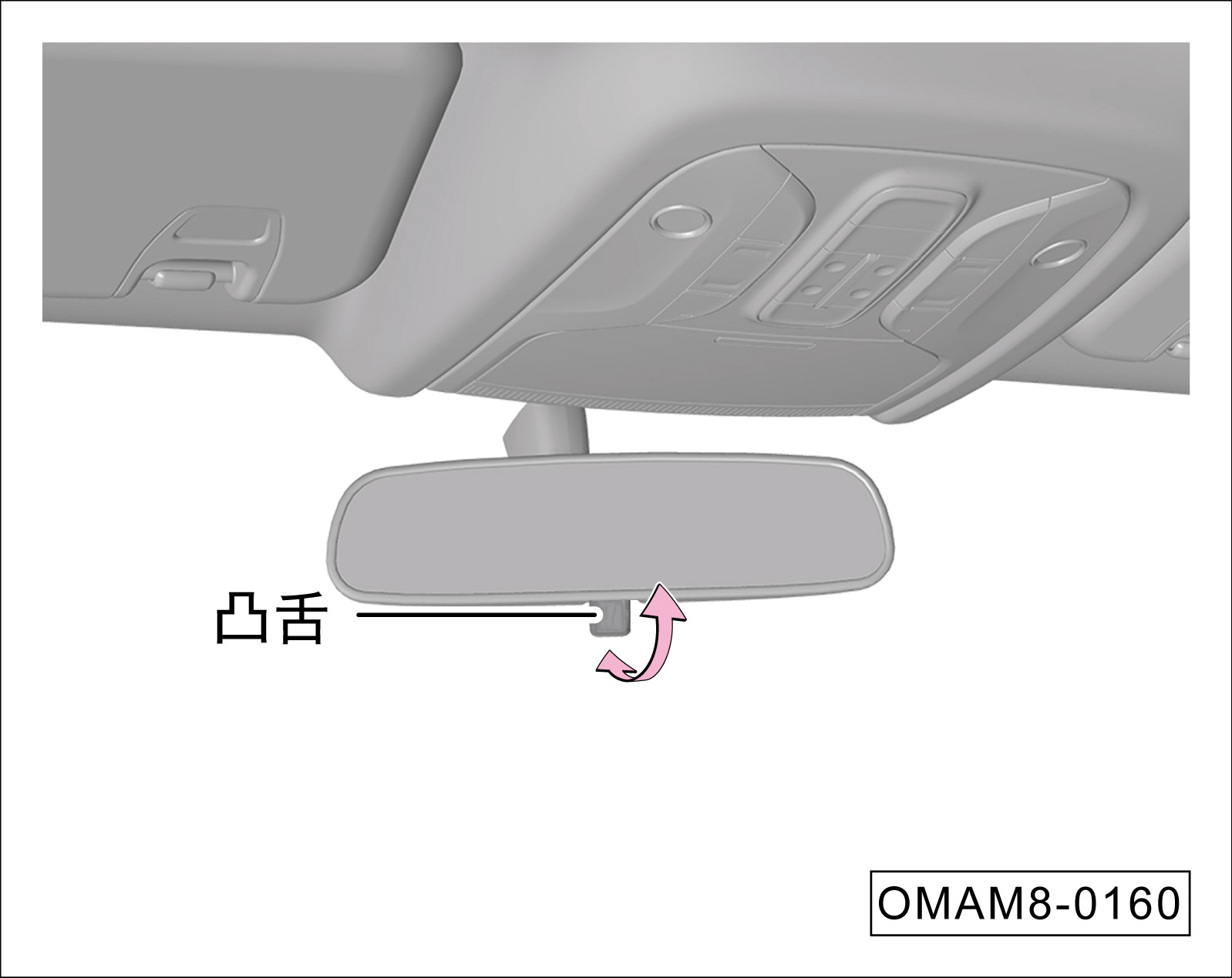 如图凸舌在正常后视角度,向前拨凸舌,可使后方照射进来的反光偏置,达到防眩目功能。