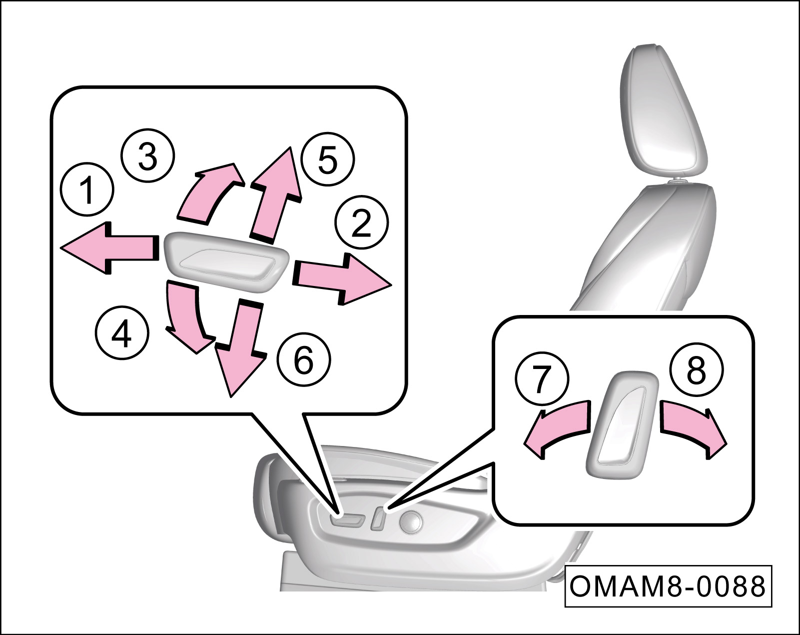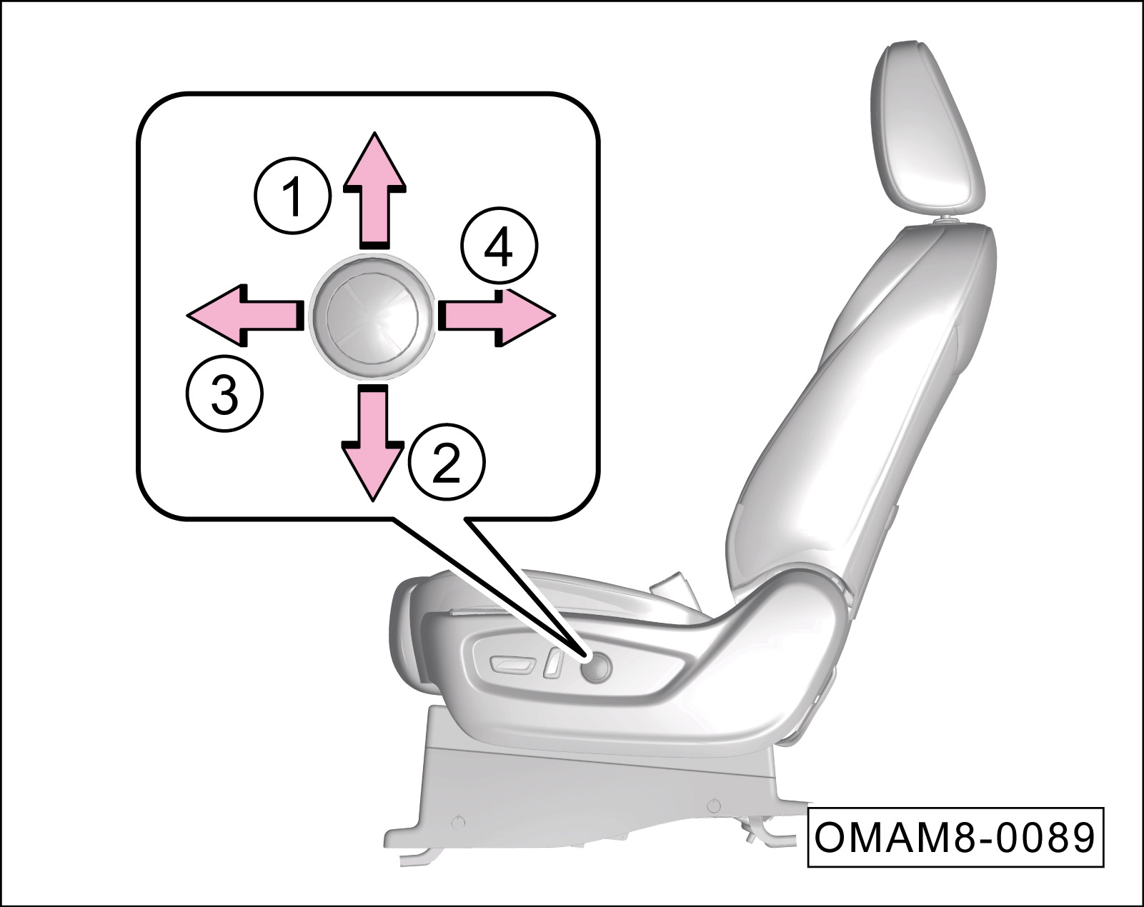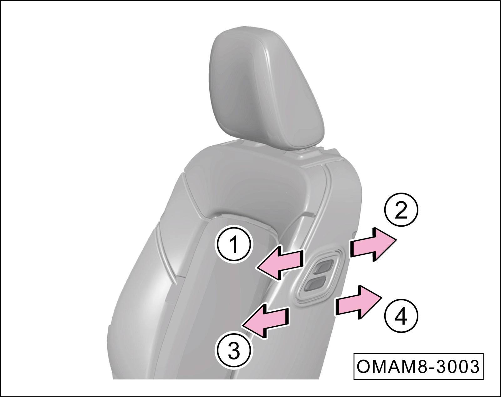 沿-箭头③-或-箭头④-方向掰动开关,可调节座椅座垫升高或降低(适用于8向电动座椅)。