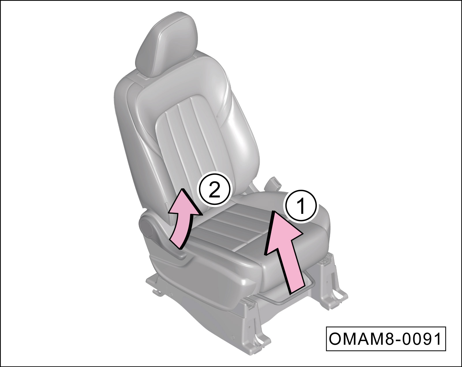 沿-箭头①-方向拉起调整拉手,可调节座椅向前或向后滑动。松开调整拉手后,略微前后滑动座椅直至座椅锁止牢固。