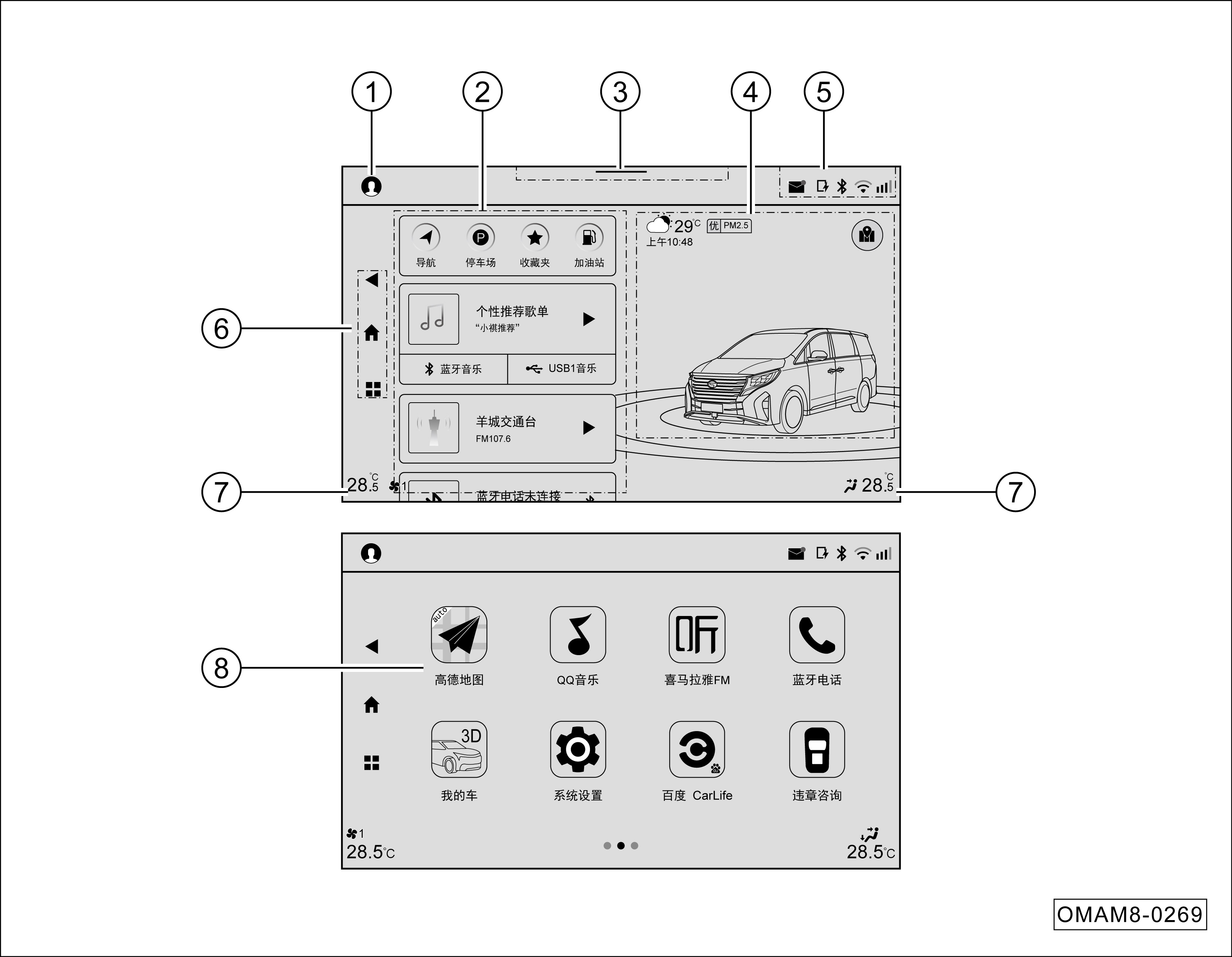前排显示屏主界面功能区域说明