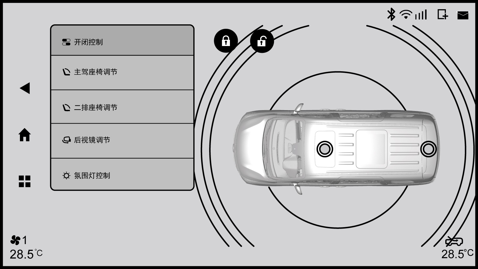 可对“开闭控制”、“主驾座椅调节”、“二排座椅调节*”“后视镜调节”、“氛围灯控制*”进行调节。