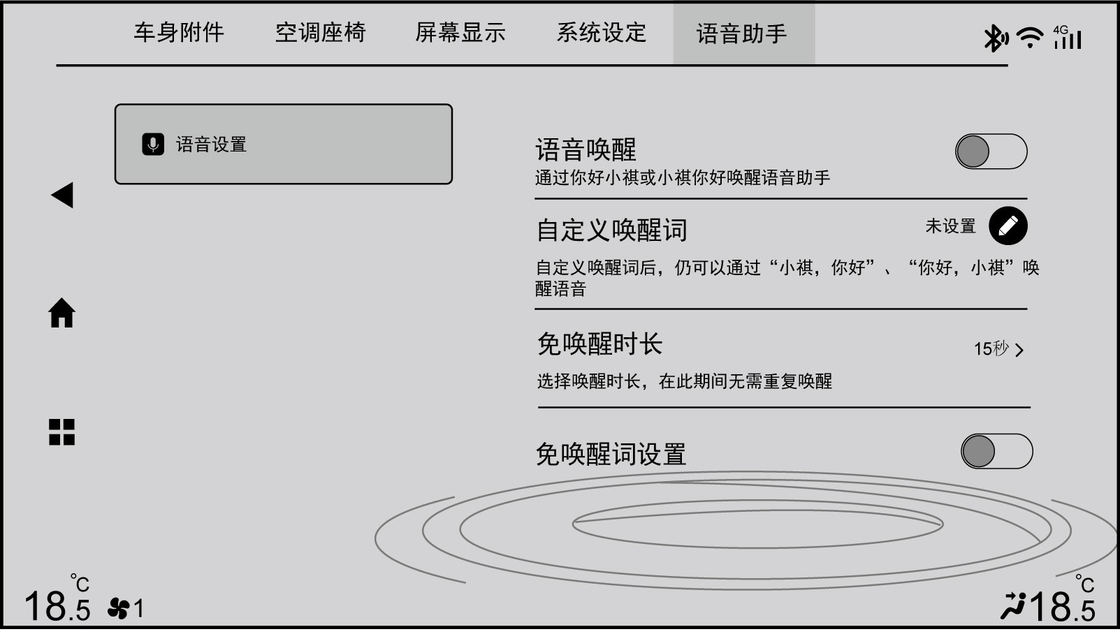 音响系统开启正常工作后,非免唤醒的语音指令在下达之前需要唤醒语音引擎,可通过以下方式启动语音功能: