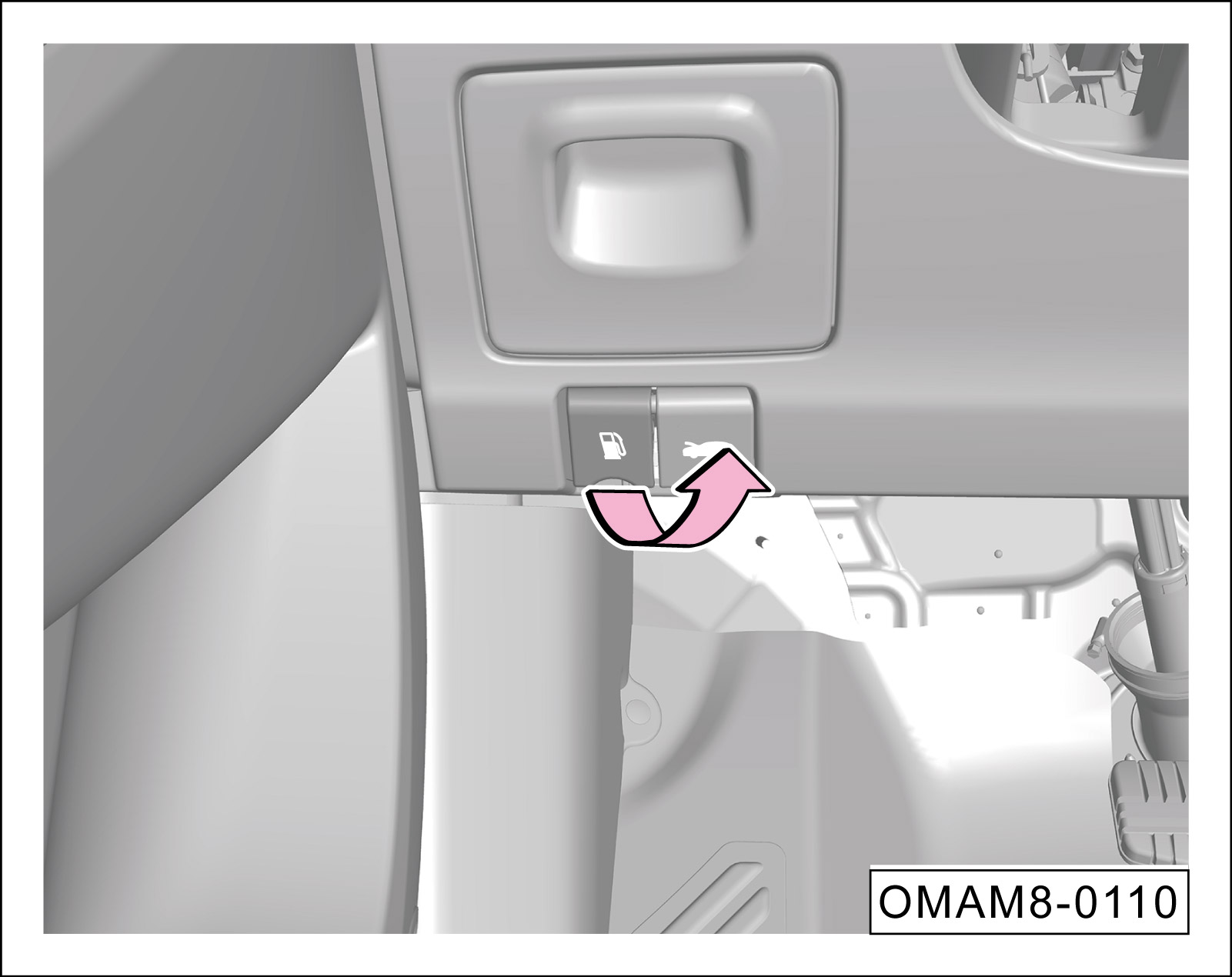 沿-箭头-方向拉驾驶员侧仪表板下方的油箱盖开启拉手,油箱盖板将向外弹起。