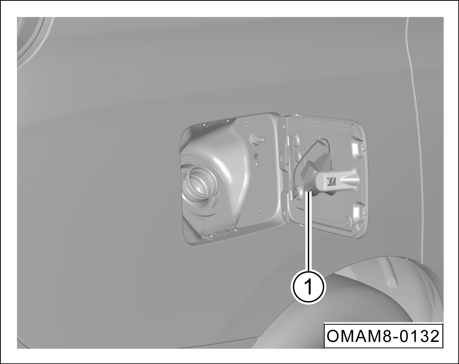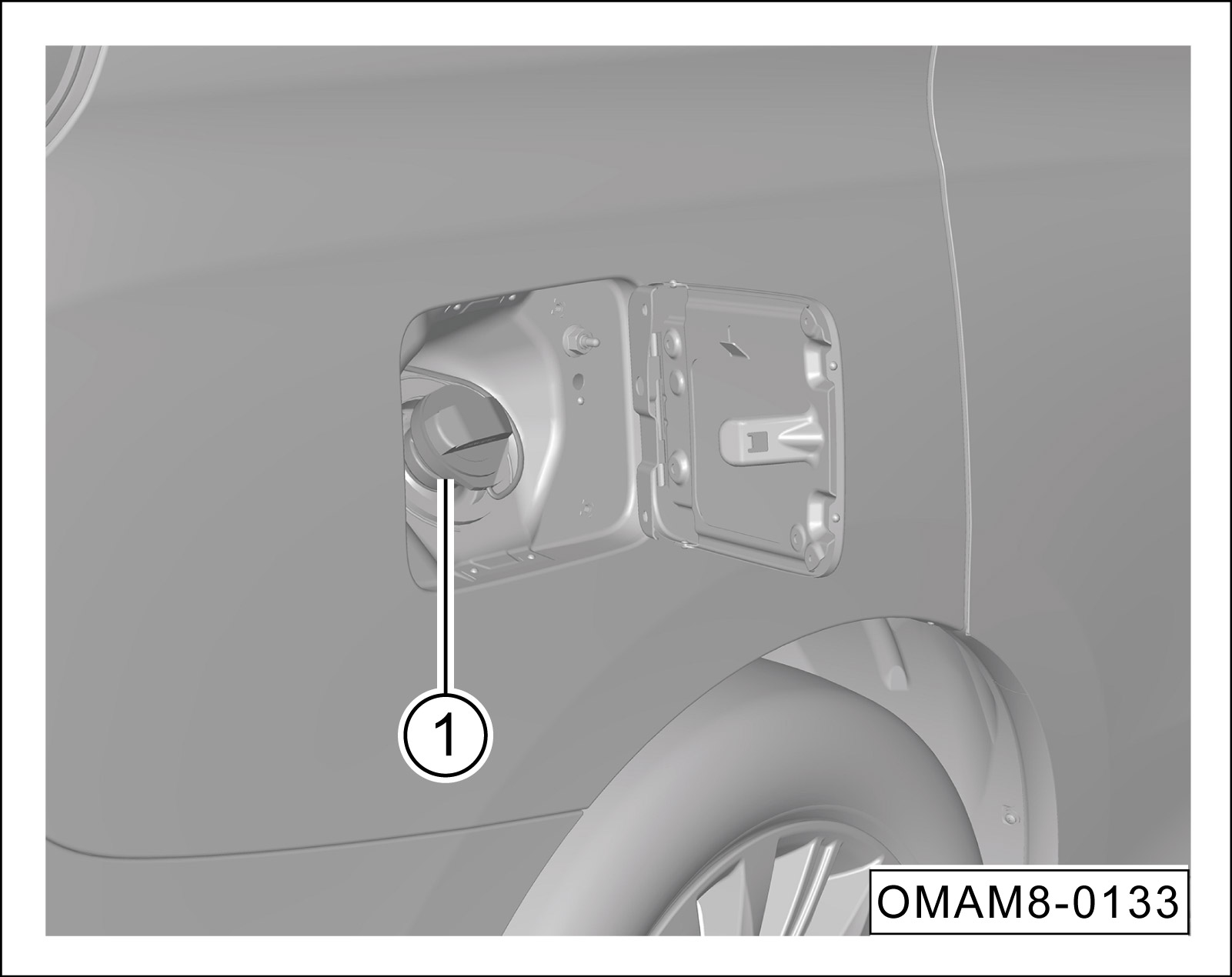 完全打开油箱盖板,逆时针缓慢旋出加油口盖①,完全拧出时将加油口盖停留在原位片刻,使燃油箱释放内部的燃油蒸汽压力,然后取出加油口盖①。