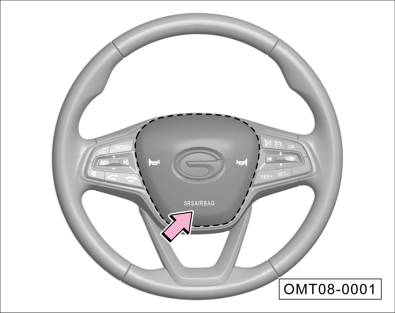 驾驶员正面安全气囊安装在方向盘内部(阴影部分),方向盘上标有“SRS AIRBAG”标志。
