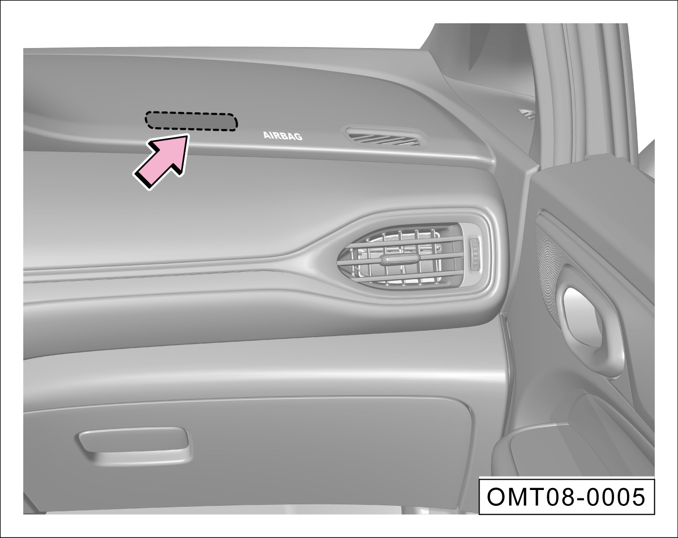 前排乘员正面安全气囊安装在仪表台内部(虚线阴影部分),仪表台上标有“AIRBAG”标志。
