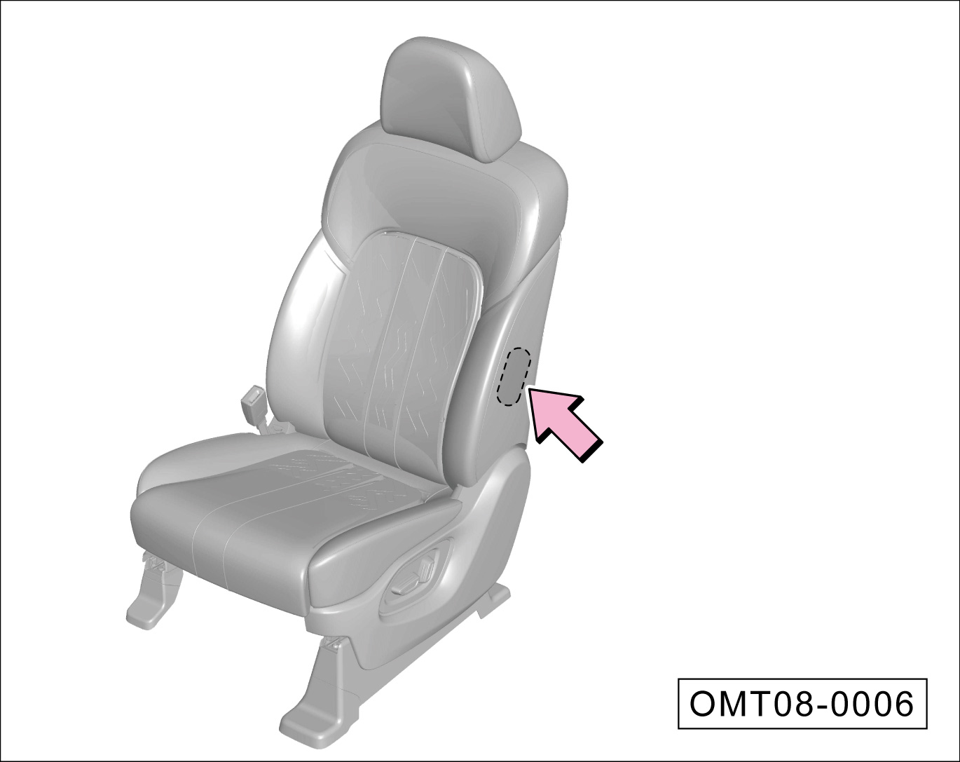 前排侧面安全气囊安装在驾驶员座椅及前排乘员座椅靠背向门侧内部(虚线阴影部分),前排座椅外侧标有“AIRBAG”标志。